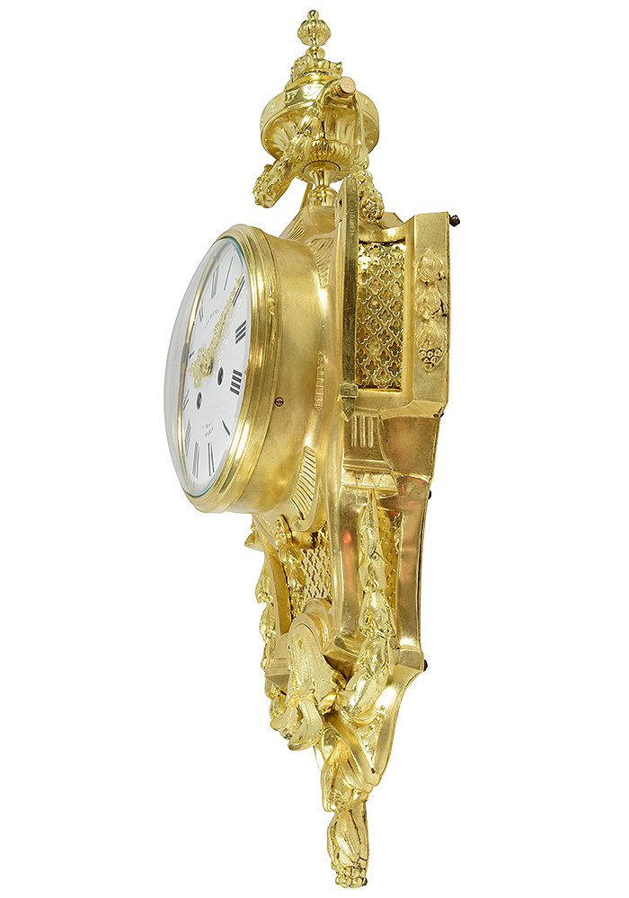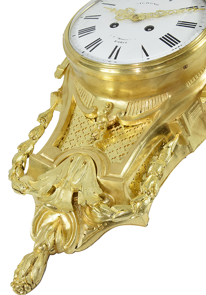 Très beau cartel d’époque Napoléon III de style transition Louis XV, Louis XVI. En bronze doré finement ciselé à décor de cinq parties grillagées, orné sur son ensemble de chûte de tore de lauriers et au sommet d’un pot couvert. Très grand cadran en émail blanc protégé par un verre bombé, aiguilles dorées finement ciselées.