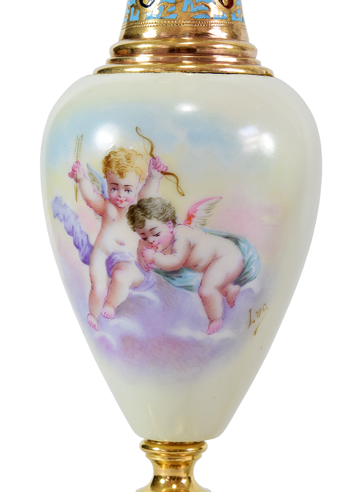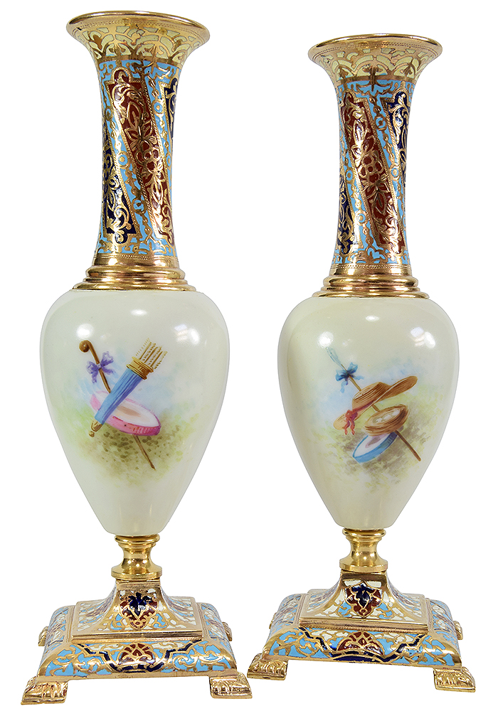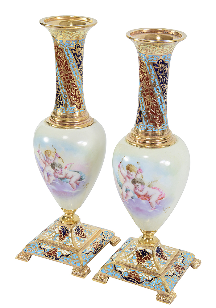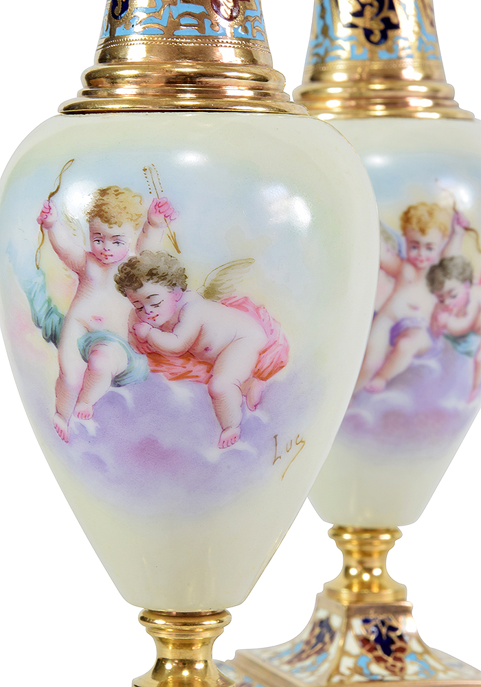Lumineuse et belle paire de vases, constitué d’un élégant mélange de bronze doré, bronze cloisonné et de porcelaine décorée de peintures à figure d’angelots et aux revers d’attributs. Chaque illustration est signée par le peintre « Luc ». Epoque Napoléon III
