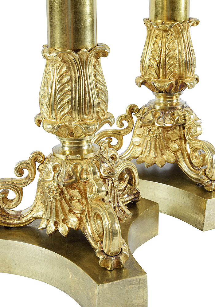 Fine et très belle paire de bougeoirs d’époque Charles X. Constitué de bronze finement ciselé doté d’une dorure de qualité au mercure, authentique et en excellent état de conservation. Base tripode, piétement à enroulement et d’un décor général de feuilles d’acanthe et palmettes. Porte bougie équipé de leur bobèche d’origine et amovible.