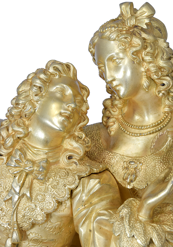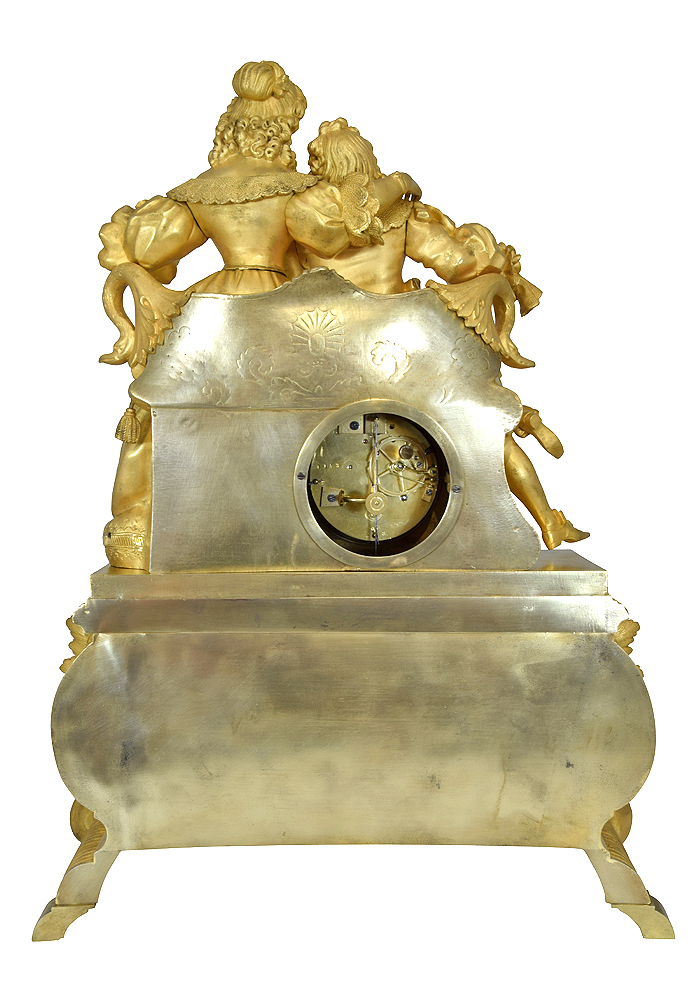 Imposante pendule d’époque Restauration vers 1820 en bronze doré au mercure d’excellente qualité, finement et richement ciselé. Scène romantique du jeune Louis XIV et de la Reine Marie-Thérèse d’Autriche offrant une montre gousset, tous deux assis sur une méridienne à col-de-cygne. Cadran en émail blanc ciselé d’un contour de perles en bronze. Large façade richement décorée de feuilles d’acanthe en haut-relief et ses cotés ciselée de canaux.