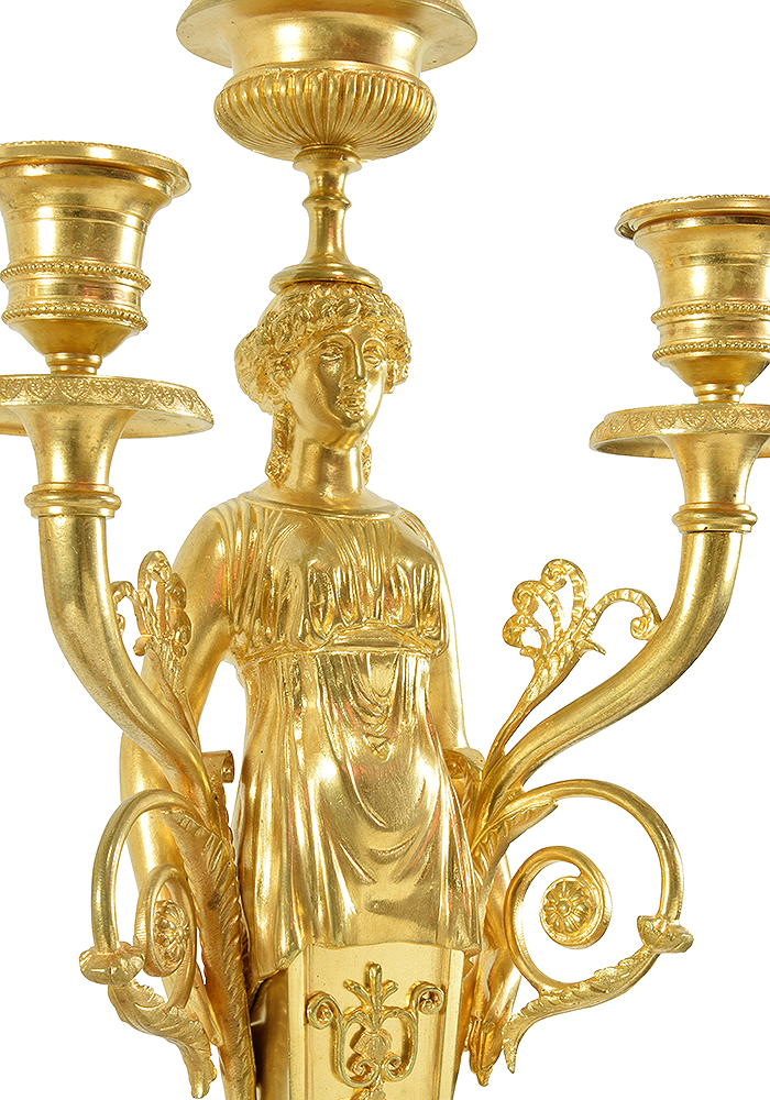 Un modèle de chandeliers très Empire et hautement décoratif par ses bustes et son architecture générale peu courant, bien équilibré en excellant état de conservation.