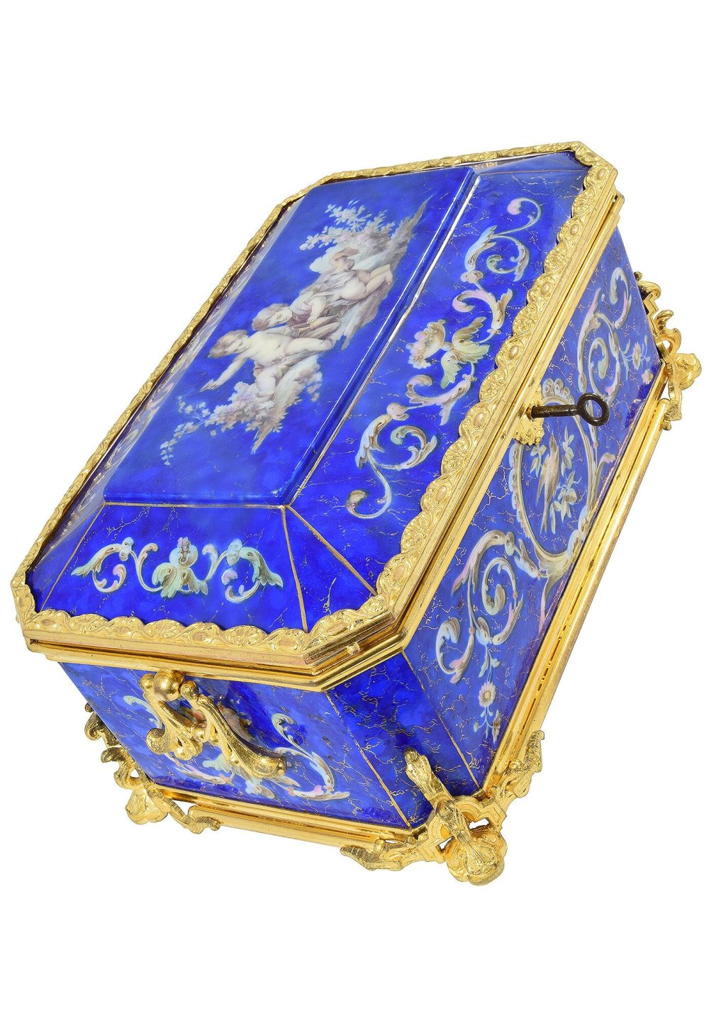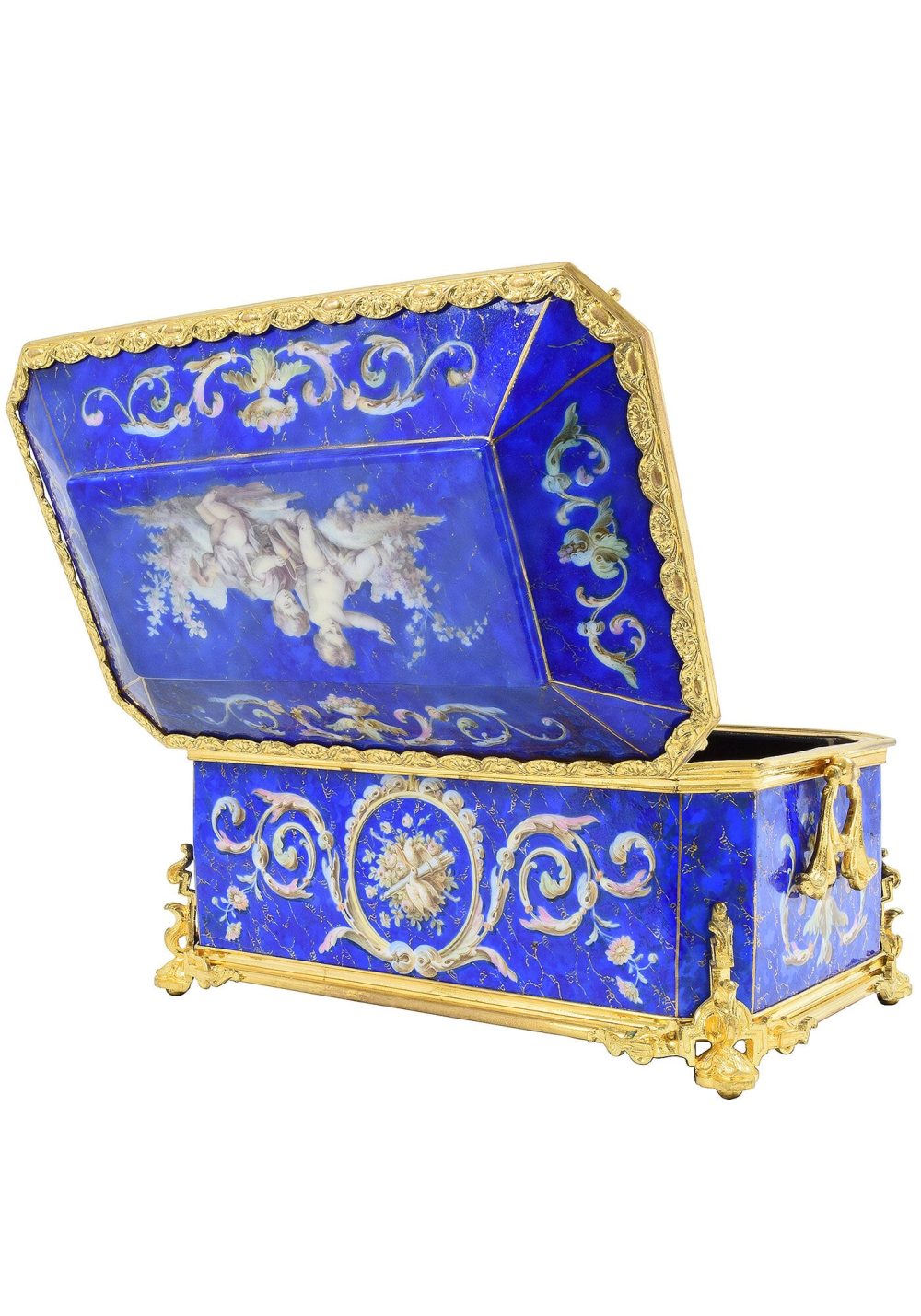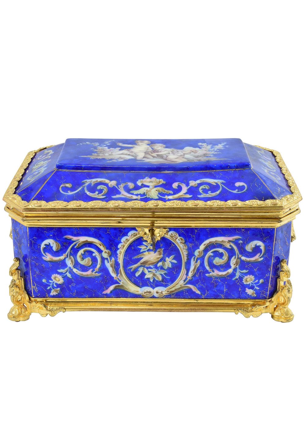 Très rare pour son état de conservation et sa provenance, grande boîte rectangulaire constitué de porcelaine finement peinte de rinceaux, colombes et d’une scène de festivité sur le dessus à figure de chérubins. Elle est équipée d’une serrure fonctionnelle, son intérieur est recouvert de velours rembourré. Ornementé de bronze doré finement ciselé. Estampillé LAHOCHE PARIS, palais royal 162 et 164, escalier de cristal, famille Hoche actif de 1847-1990. Époque Napoléon III.