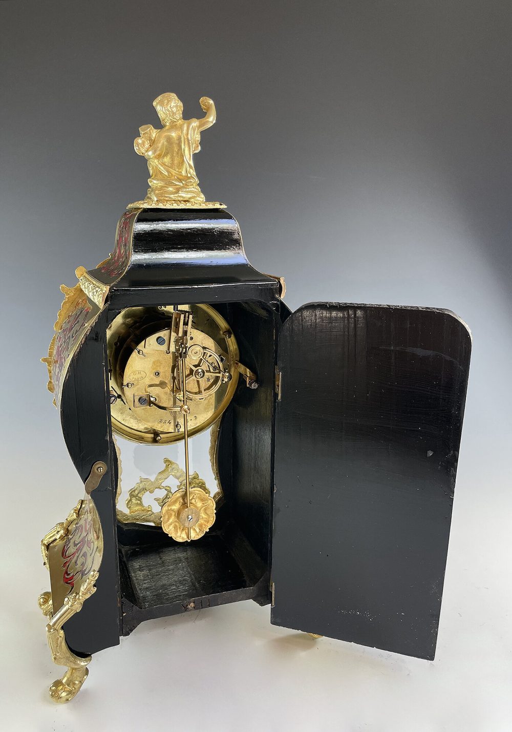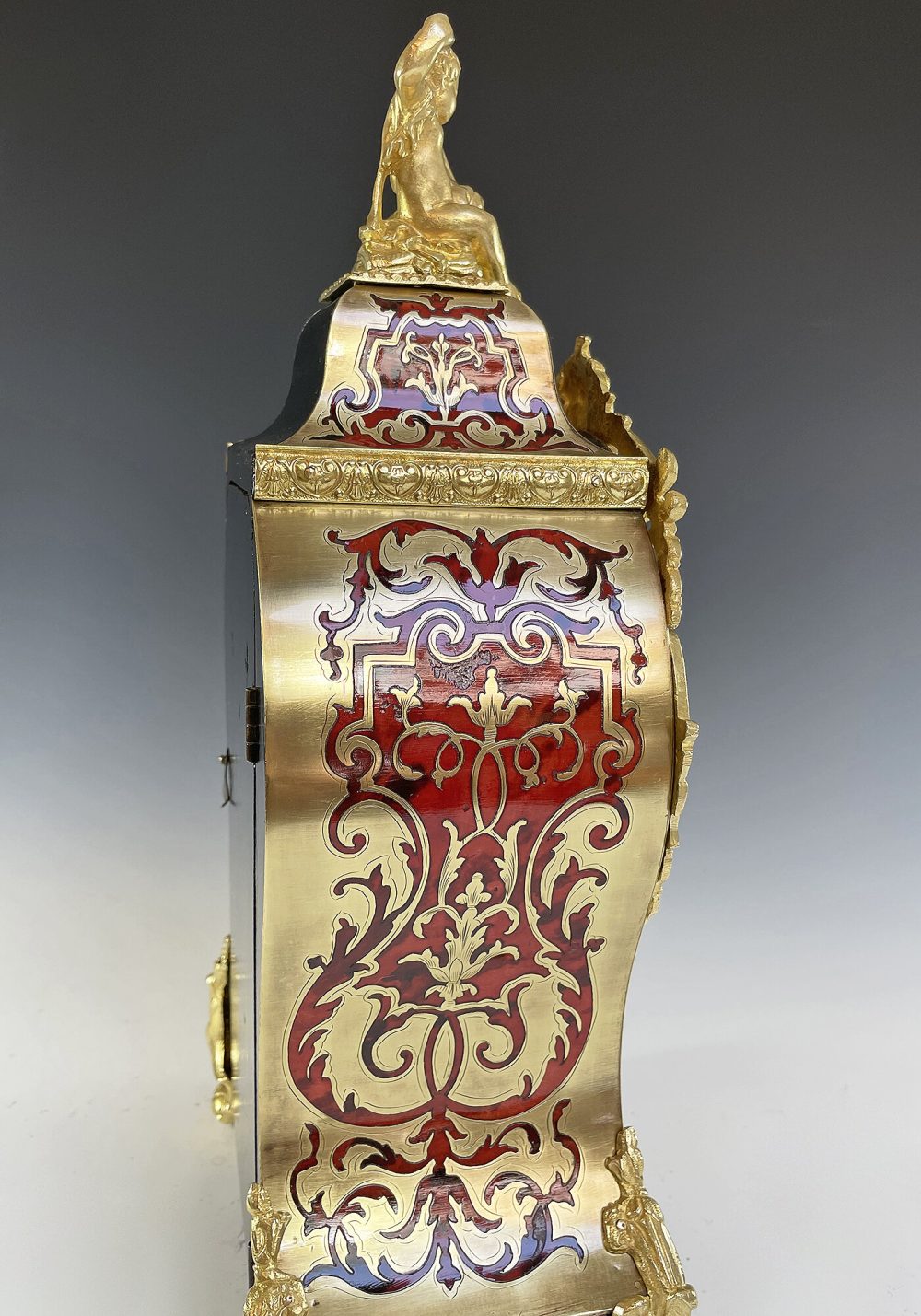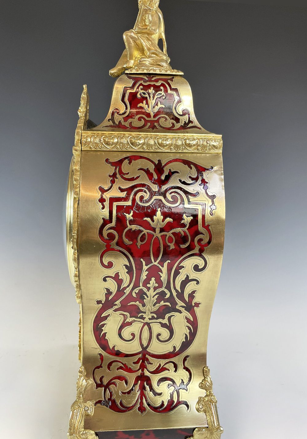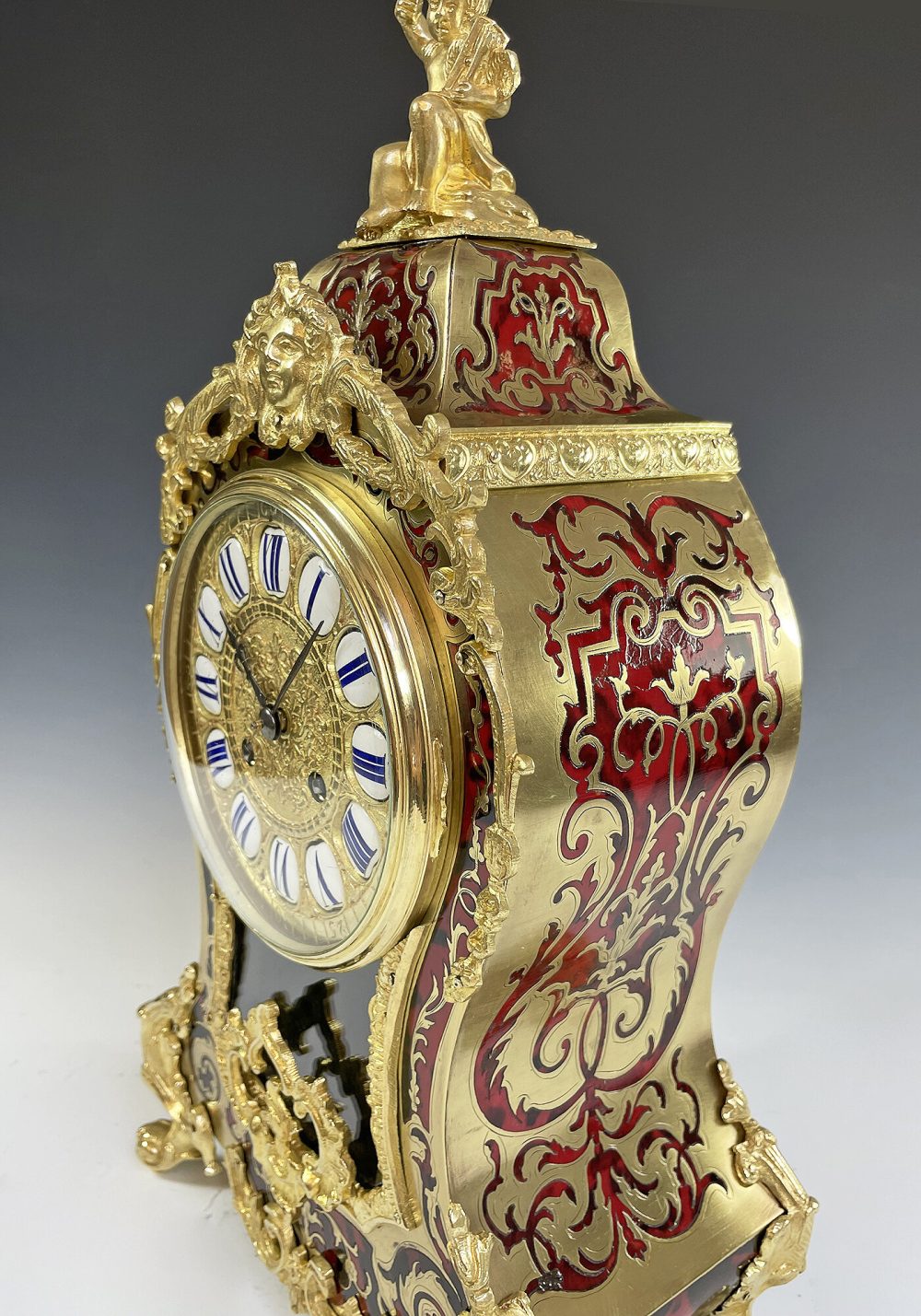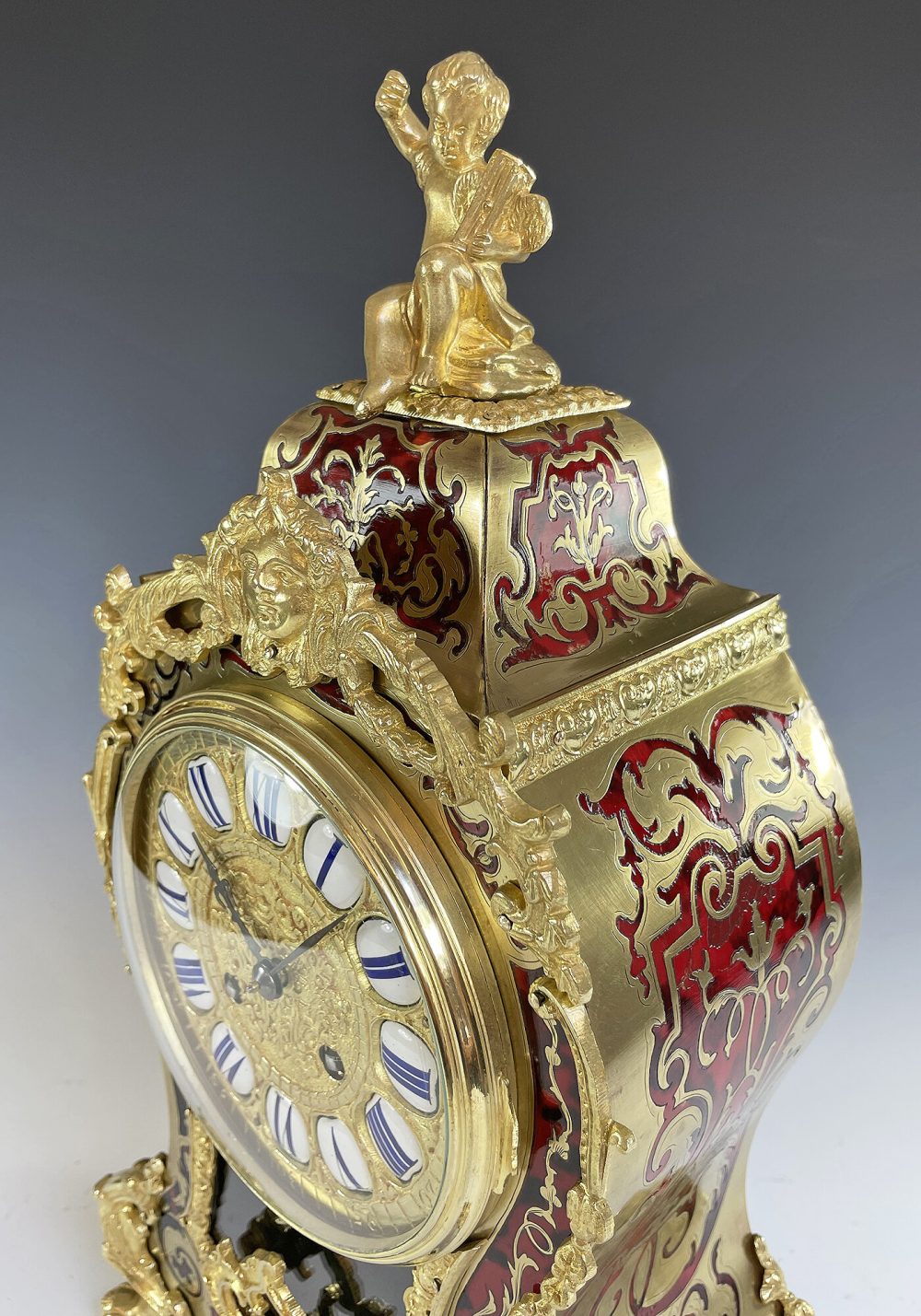 Leuchtendes Kartell mit sichtbarem Pendel aus der Zeit Napoleons III. im Stil Ludwigs XV. Lebendige Architektur, bedeckt mit einem prächtigen roten Furnier mit Nuancen in Schwarz in Schildpatt, begleitet von einer reichen und feinen Intarsieneinlage in Boulle-Technik aus vergoldetem Messing mit Scrollmotiven. Elegante, hochwertige Verzierung aus vergoldeter und gemeißelter Bronze mit Blattmotiven, weiblicher Maske und oben bekrönt von einem Cherub, der eine Sanduhr mit Flügeln hält, die die Zeit symbolisieren.