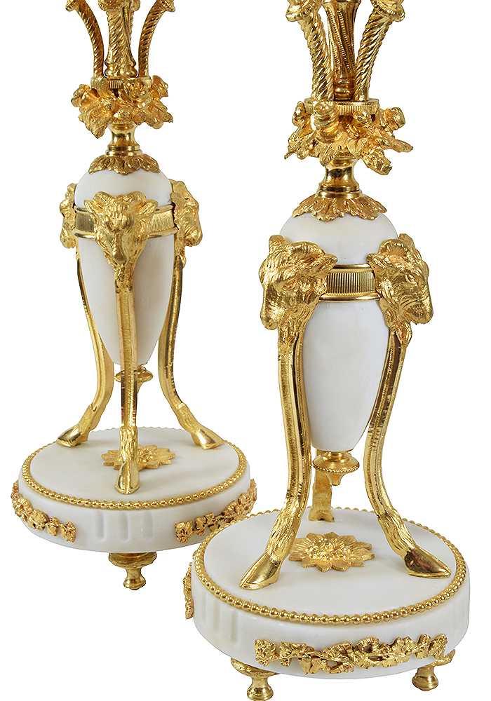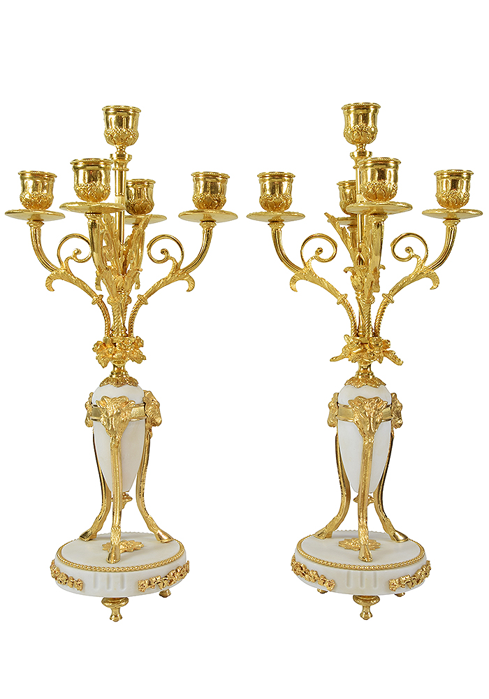 Élégante paire des chandeliers d’époque Napoléon III. De très bonne manufacture constitué de marbre blanc et de bronze doré finement ciselé. Base en architecture de forme athénienne à tête de beliers, soutenant les chandeliers à cinq feux de lumières. Chaque bras de lumière sont finement travaillé de torsades et d’enroulement. Base ronde ornée de frises de végétaux, contour de perles et de trois pieds toupies. Chaque porte bougie est équipée d’une bobèche d’origine et amovible. Ensemble lumineux et très décoratif.