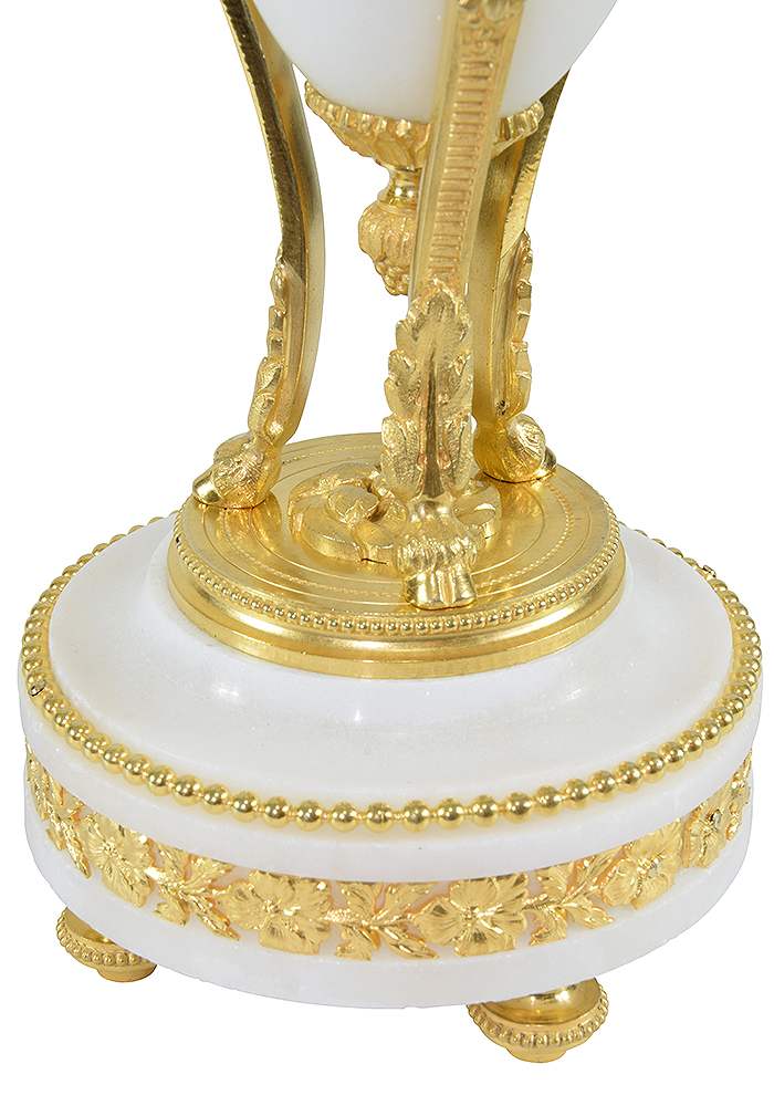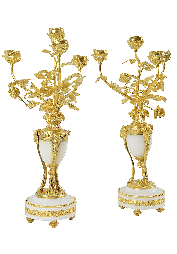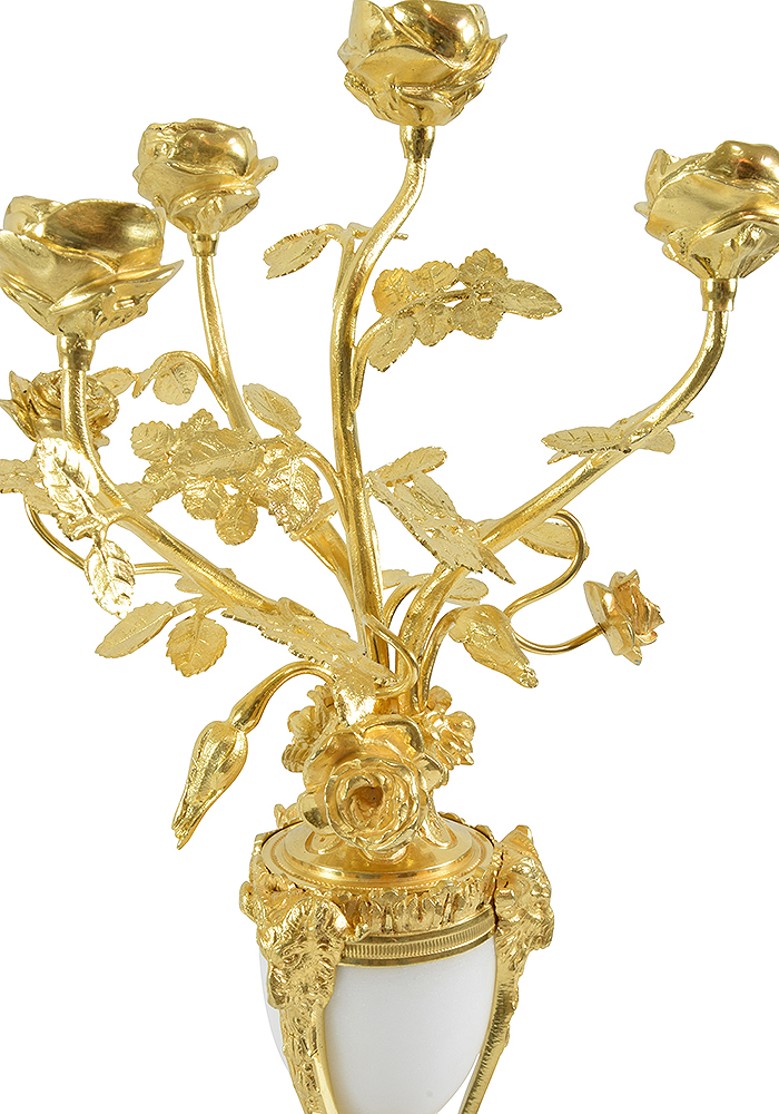 Très belle paire de chandeliers dans le style Louis XVI d’époque Napoléon III, composés en marbre blanc de carrare et de bronze doré. Chandelier à trois feux de lumière formant un véritable bouquet tel que bourgeons, pétales et fleurs. Piétement tripode à tête de bélier relié par des guirlandes de fleurs, finissant par un piétement à sabot. Base ronde sertie d’un contour de rang de perles et d’une frise ajouré.