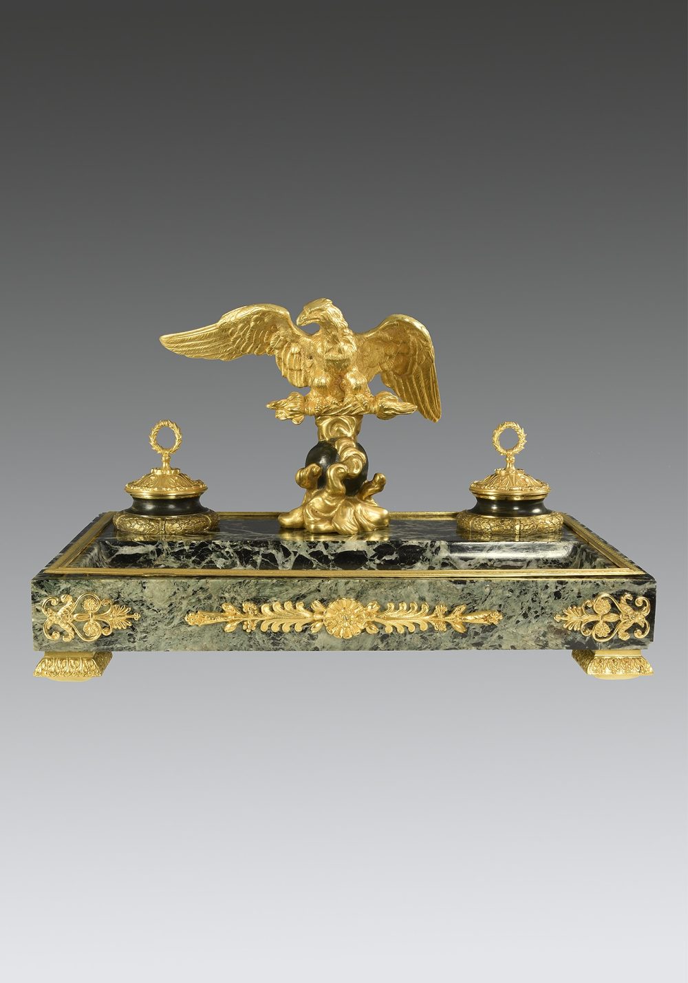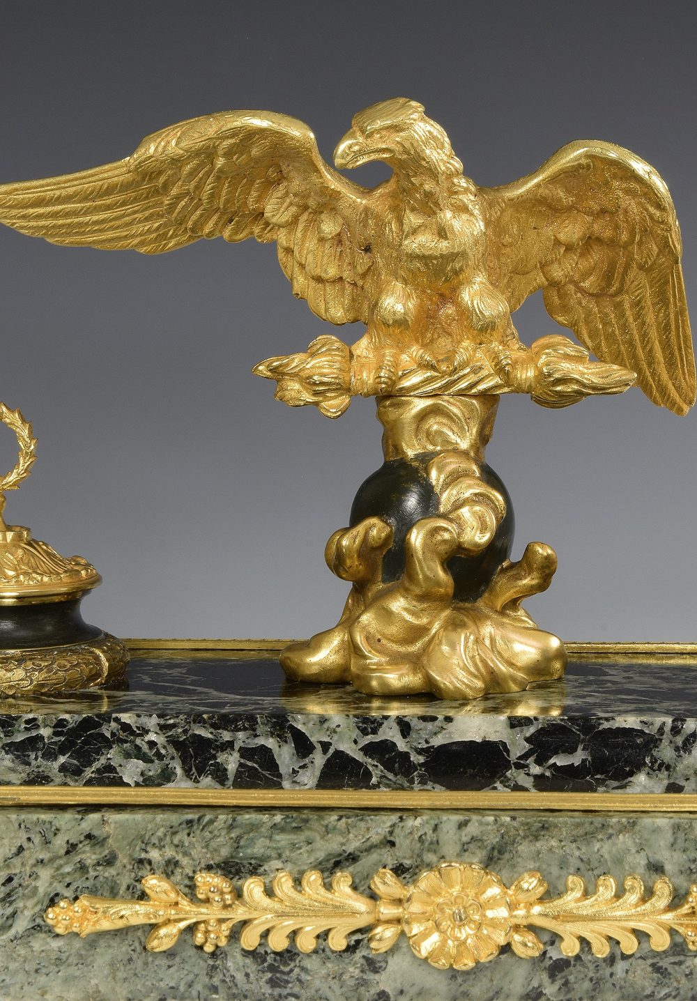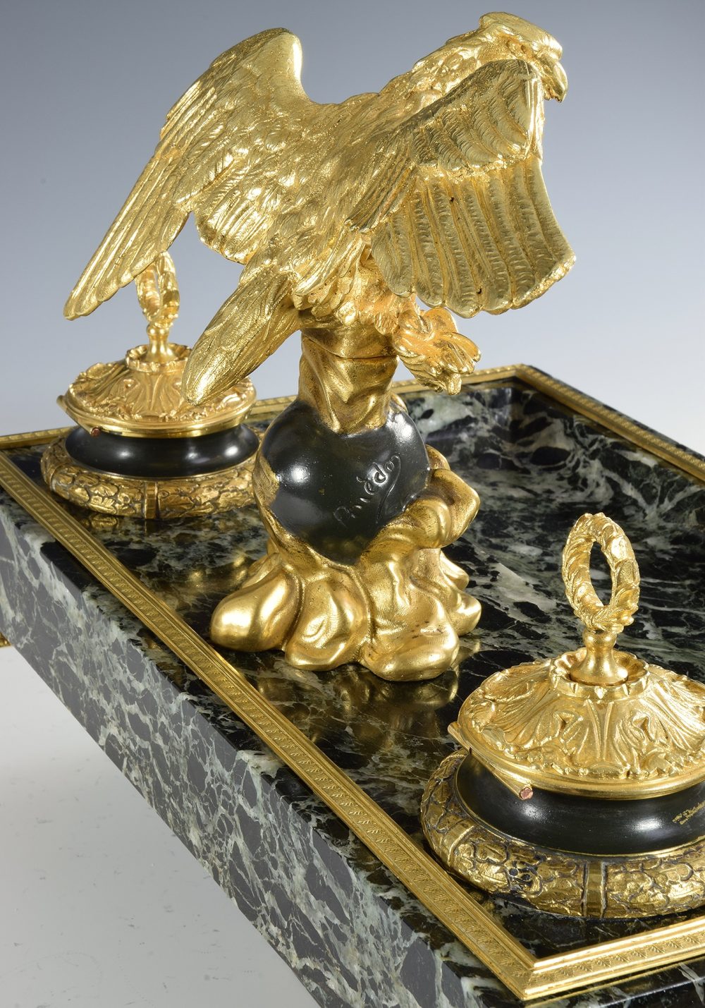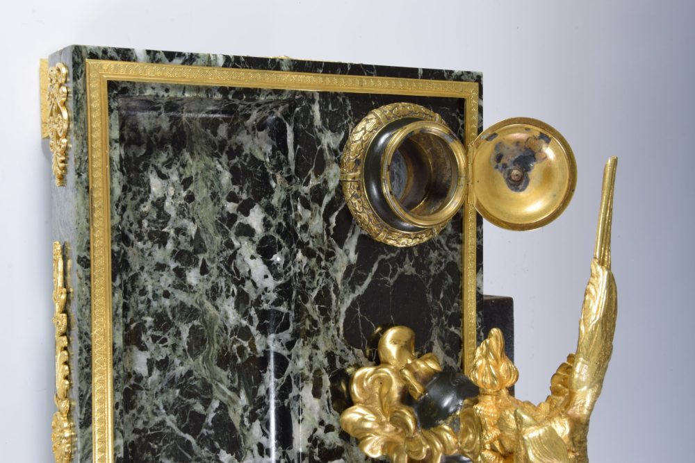 Prächtiges Tintenfass im Empire-Stil aus der Zeit Napoleons III., signiert „Pinédo“ für Émile Pinedo (1840-1916), Hersteller künstlerischer Bronzen. Besteht aus einer massiven Platte aus sehr schönem meergrünem Marmor, die reich mit fein gemeißelter vergoldeter Bronze verziert ist und an drei Seiten mit Palmetten und Rosetten sowie einem gemeißelten Rahmen aus Wasserblättern geschmückt ist.