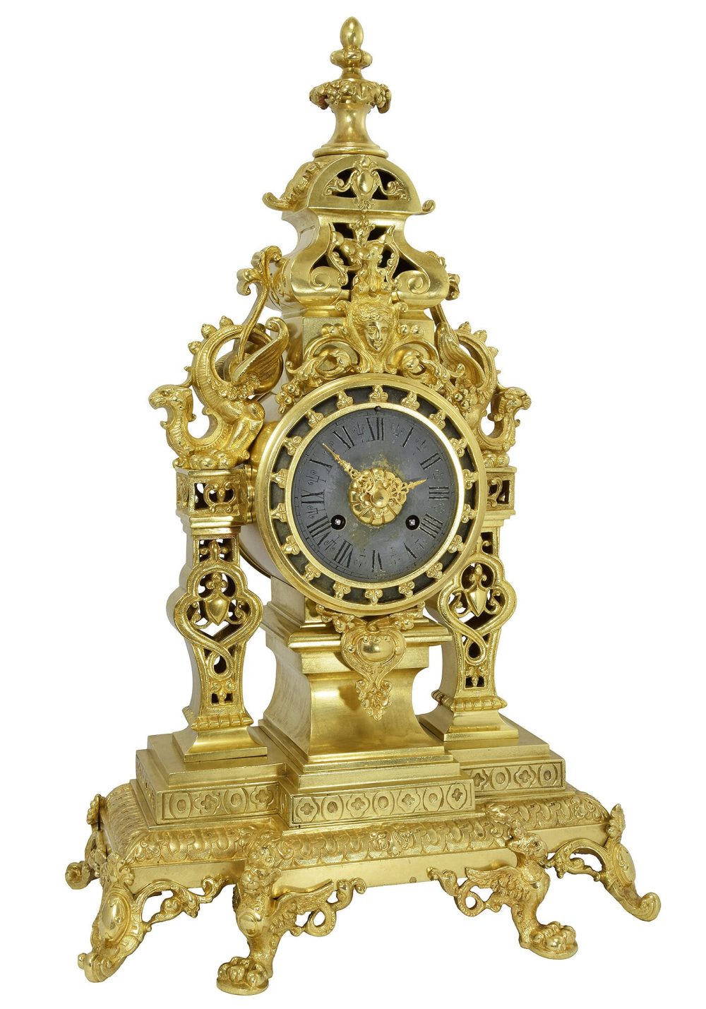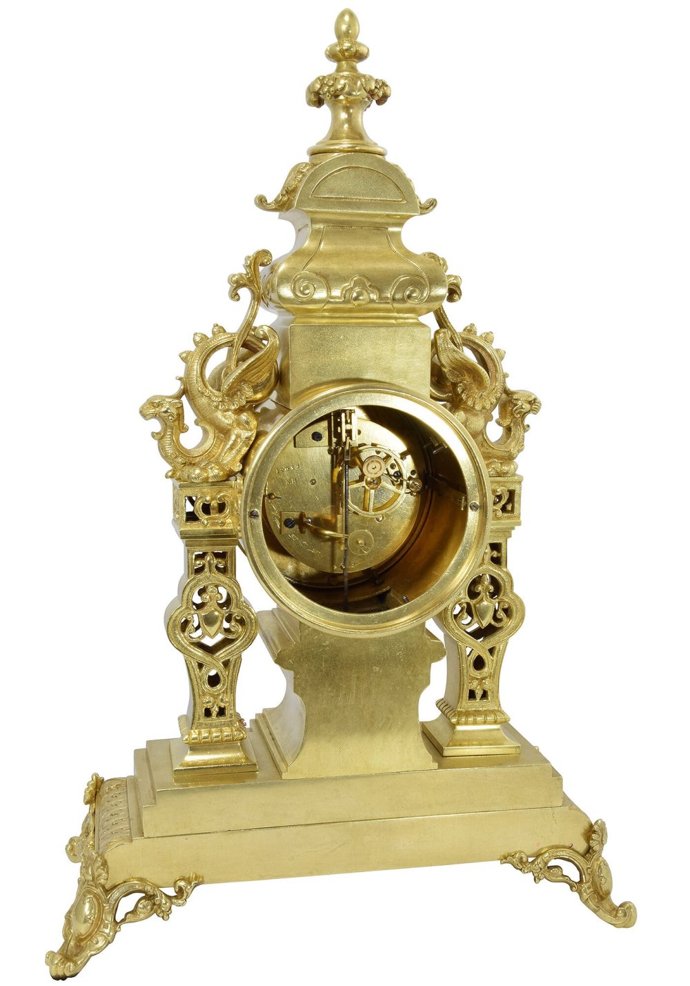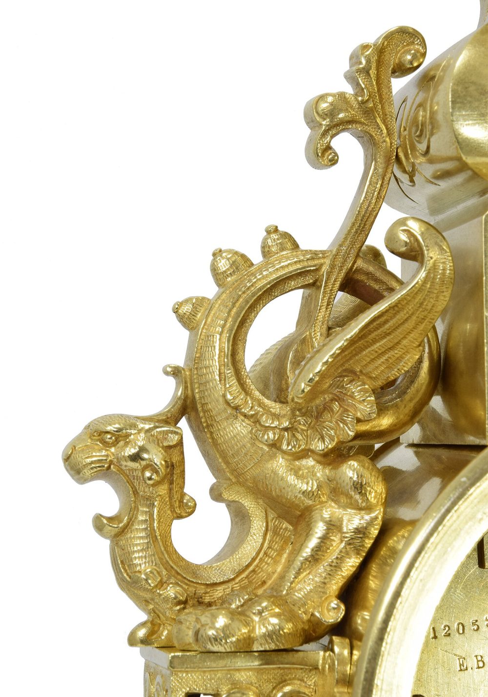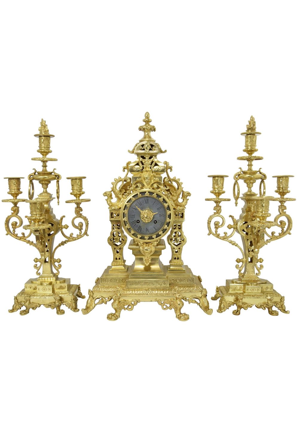 Sehr dekorativer und imposanter Zierrat, super Modell, komplettes Set von sehr guter Qualität im klassizistischen Stil und aus der Zeit Napoleons III. Stark vergoldete Bronzearchitektur, die als Ganzes durch durchbrochene Säulen sowie zahlreiche Köpfe mythologischer Tiere und fein gemeißelte Muster gekennzeichnet ist, die reich mit Verzierungen aus Windungen, Pflanzen und geometrischen Mustern verteilt sind.