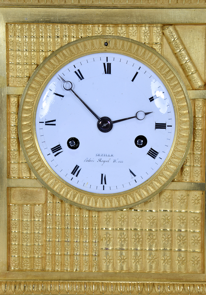 Pendule bibliothèque en bronze doré au mercure d’époque Empire. Signé de Sezille, Palais royal n°133, horloger référencé dans le Tardy, dictionnaire des horlogers Français. De forme borne le cadran bombé en émail blanc est inscrit dans une bibliothèque, orné au sommet d’un enfant à la lecture.
