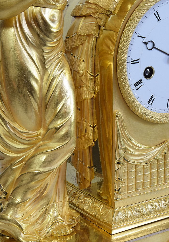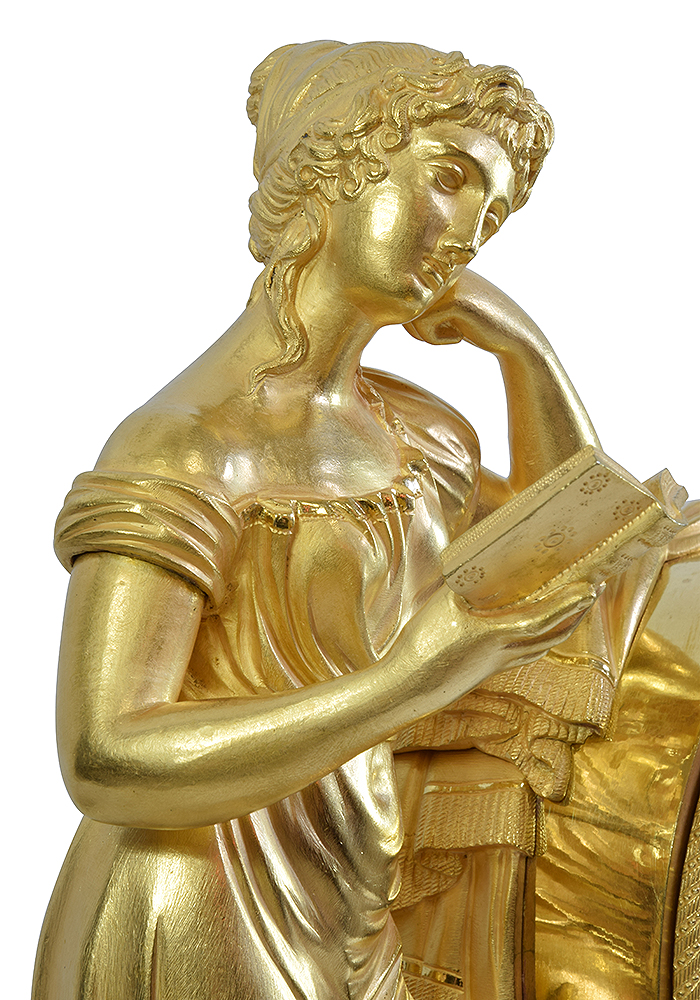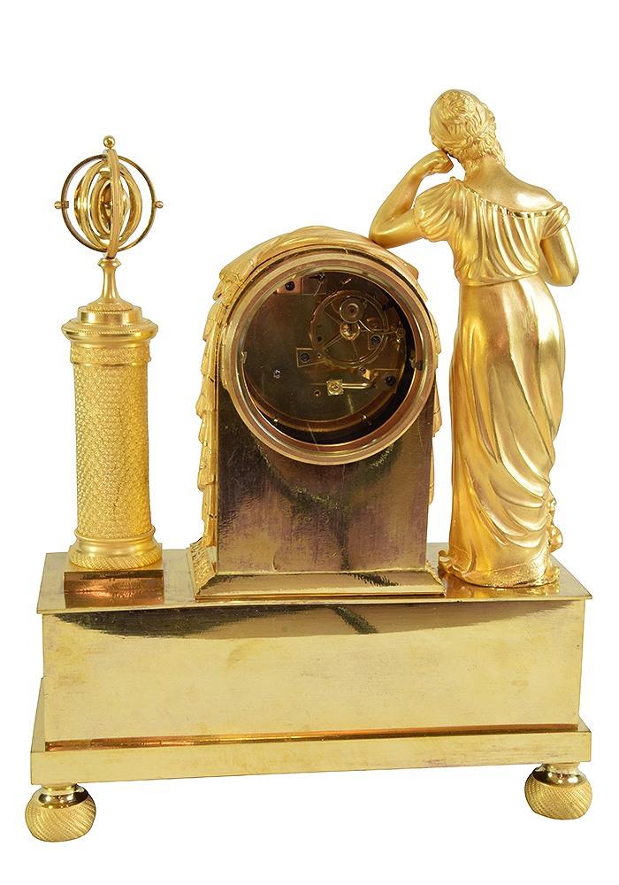 Magnifique pendule d’époque Empire en bronze doré au mercure, doté d’une dorure de qualitée dans un état de conservation optimal. Illustrant le thème de l’astronomie à figure de la Muse Uranie lisant, accoudé à une bibliothèque. Sphère armillaire articulé reposant sur une colonne ronde guillochée.