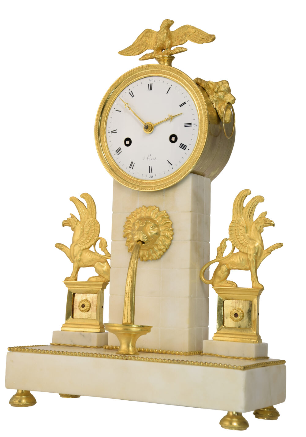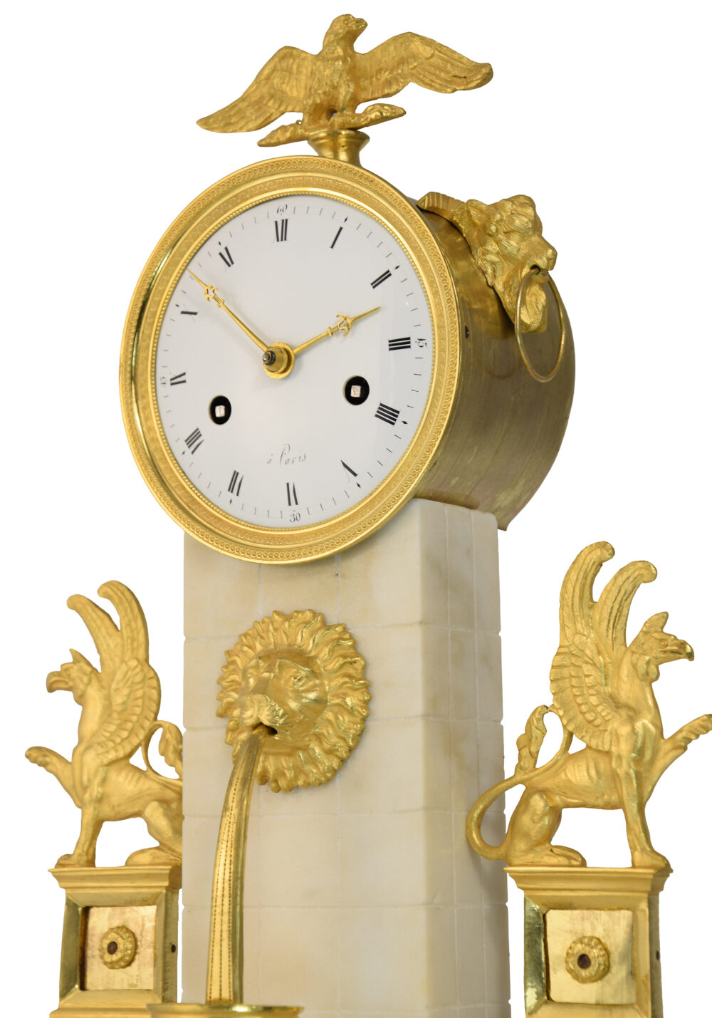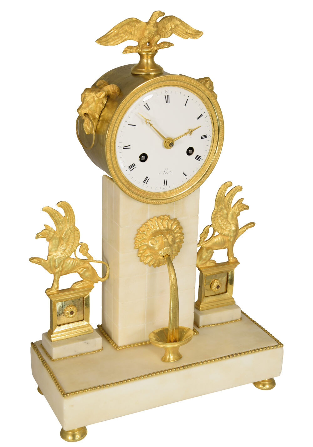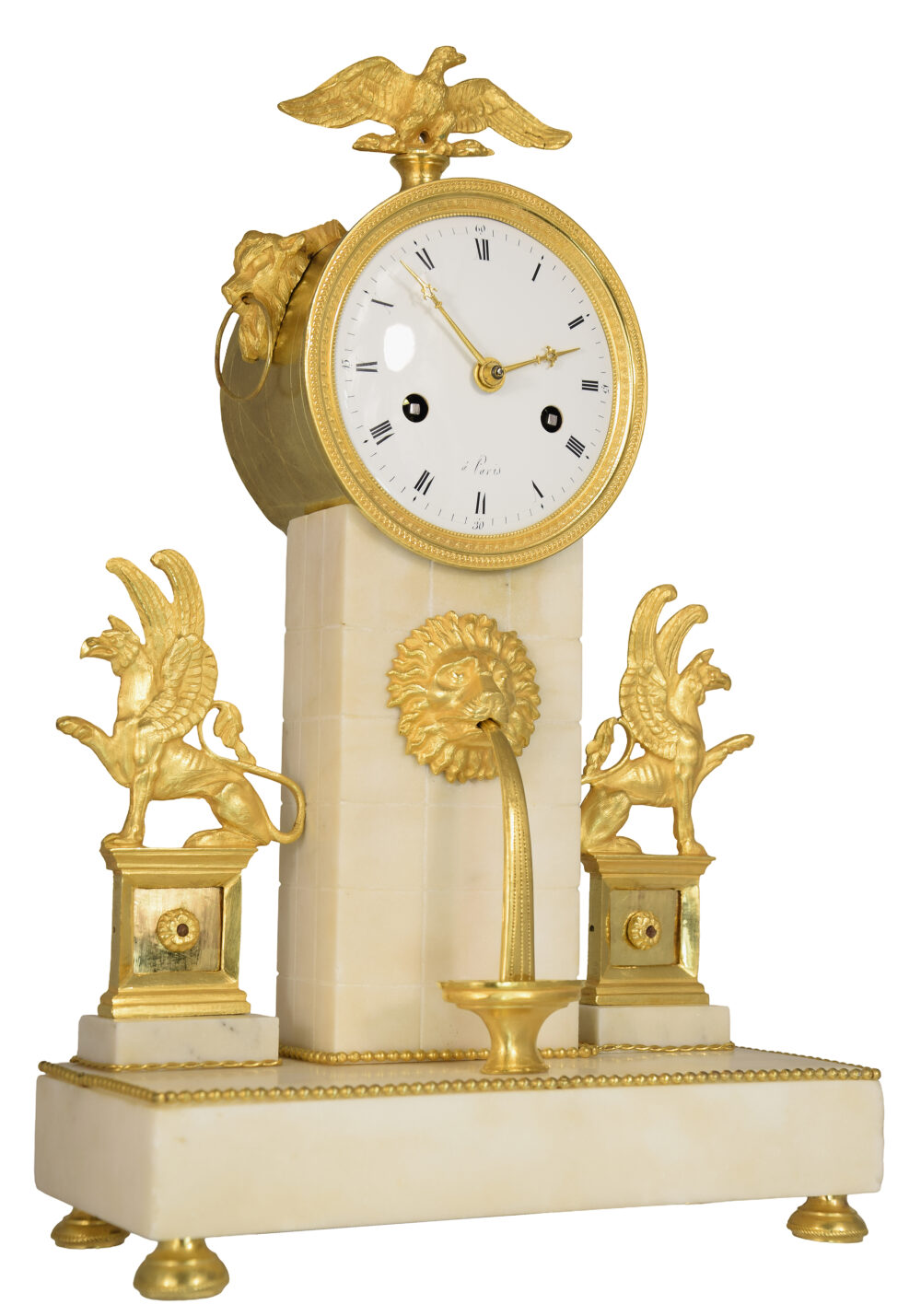 Empire-Uhr um 1810, interessant mit reichen, fein gemeißelten Verzierungen aus vergoldeter Bronze mit Quecksilber und Gold. Architektur aus weißem Marmor, die einen Brunnen darstellt, dessen ziegelförmiger Mittelteil einen prächtigen Löwenkopf beherbergt, aus dessen Mund Wasser fließt und in ein Becken fließt. Dieser Brunnen wird durch zwei auf jeder Seite verteilte Greifen hervorgehoben. An der Spitze dieses Brunnens befindet sich das gewölbte weiße Emaille-Zifferblatt, das von goldenen Zeigern begleitet und durch einen Palmettenumriss hervorgehoben wird. Das Zifferblatt ist mit Widdermäulern verziert und an der Spitze befindet sich ein prächtiger Adler mit ausgebreiteten Flügeln.