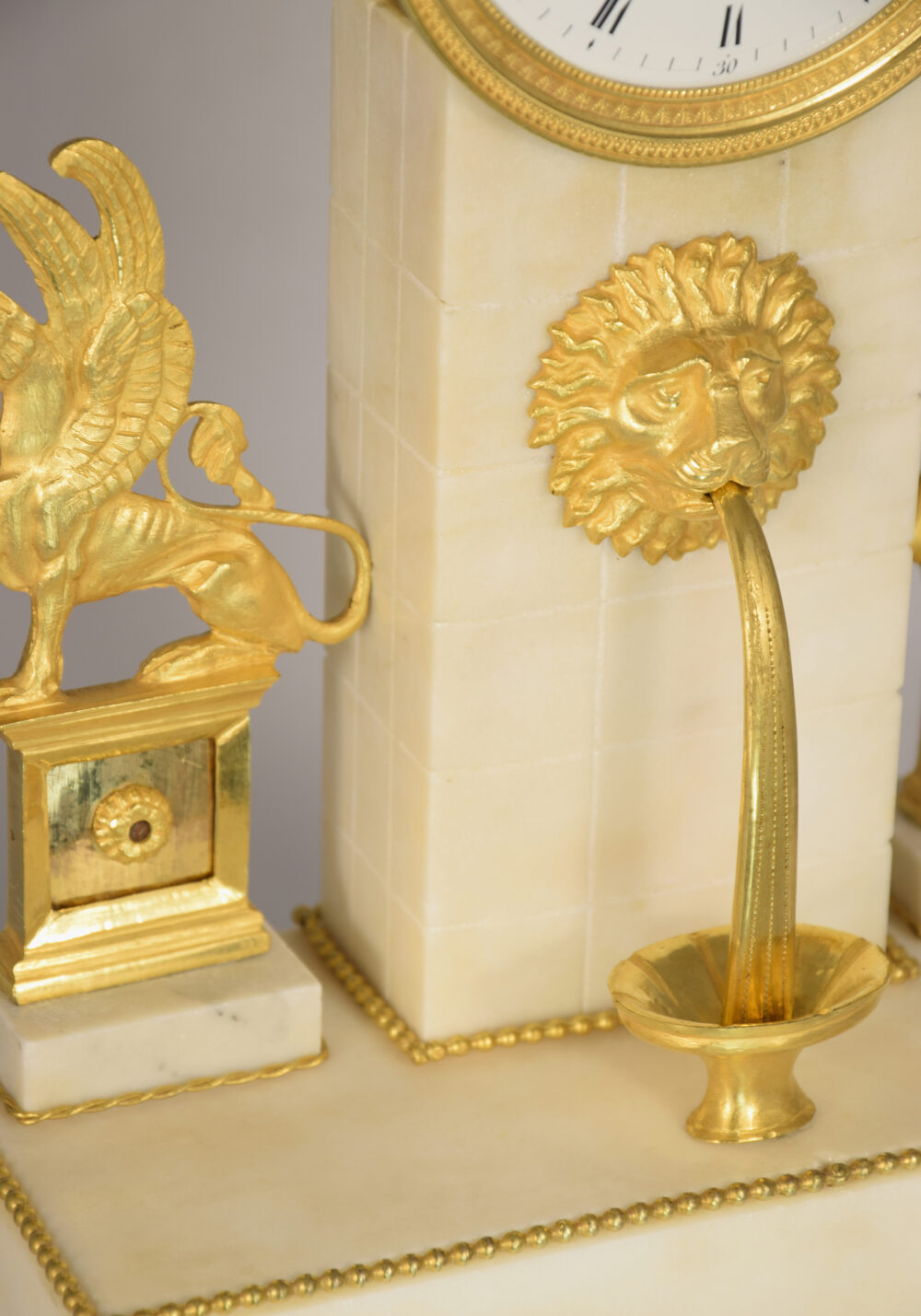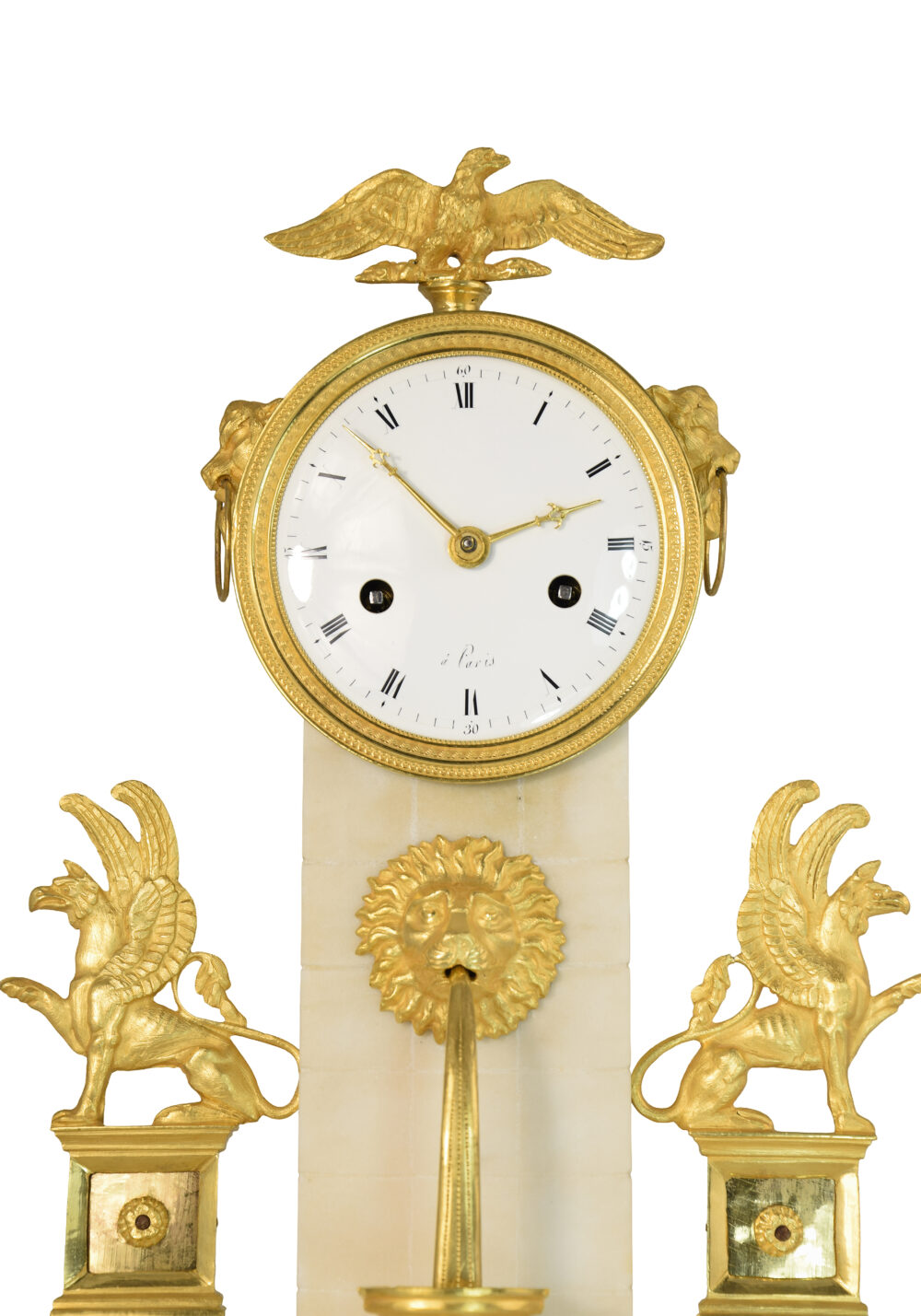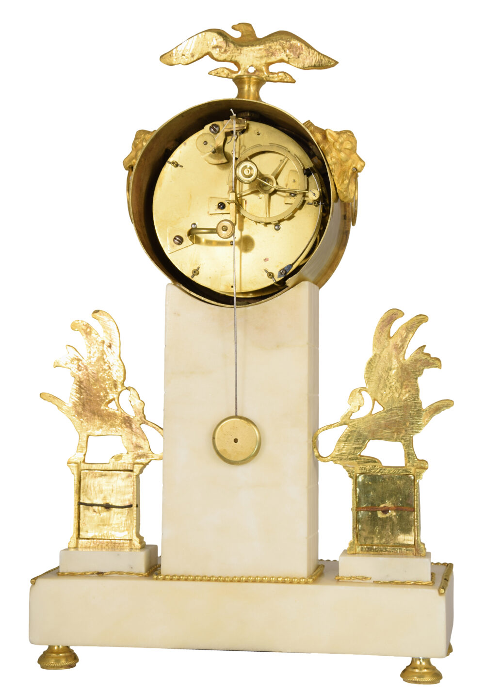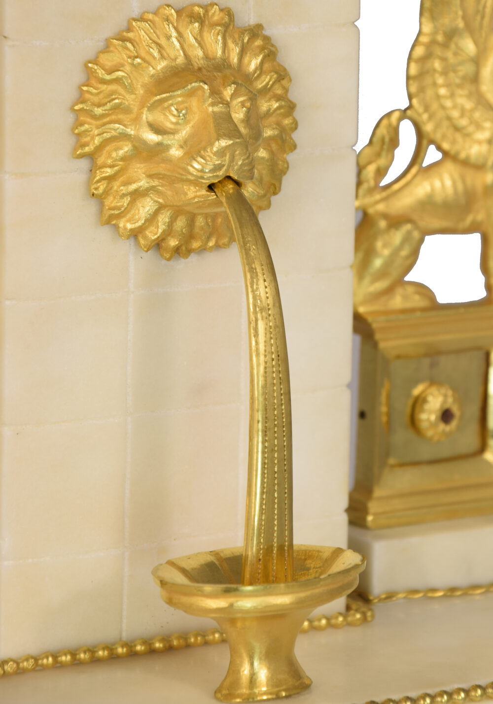 Empire-Uhr um 1810, interessant mit reichen, fein gemeißelten Verzierungen aus vergoldeter Bronze mit Quecksilber und Gold. Architektur aus weißem Marmor, die einen Brunnen darstellt, dessen ziegelförmiger Mittelteil einen prächtigen Löwenkopf beherbergt, aus dessen Mund Wasser fließt und in ein Becken fließt. Dieser Brunnen wird durch zwei auf jeder Seite verteilte Greifen hervorgehoben. An der Spitze dieses Brunnens befindet sich das gewölbte weiße Emaille-Zifferblatt, das von goldenen Zeigern begleitet und durch einen Palmettenumriss hervorgehoben wird. Das Zifferblatt ist mit Widdermäulern verziert und an der Spitze befindet sich ein prächtiger Adler mit ausgebreiteten Flügeln.