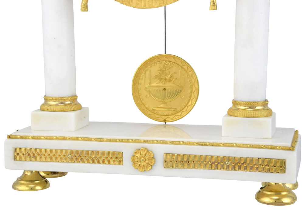 Der Sockel, der auf einem rechteckigen Marmorsockel ruht und von einem zarten Perlenfries hervorgehoben wird, ist an der Vorderseite mit zwei fein ziselierten Applikationen geschmückt, die mit Punkten und Kanneluren verziert sind und ein strahlendes, zentrales Blumenmotiv einrahmen – ein Symbol für Harmonie und Vollkommenheit. Die gedrechselten Füße gewährleisten die Stabilität des Kunstwerks und verleihen ihm gleichzeitig eine kostbare und raffinierte Note. Von diesem Sockel erheben sich zwei perfekt proportionierte zylindrische Säulen aus weißem Marmor, die mit Kapitellen und Basen aus fein guillochierter, vergoldeter Bronze versehen sind. Diese Säulen erinnern an klassische Architektur und verleihen der Uhr das Aussehen eines Tempelportikus, wodurch die Vertikalität und Feierlichkeit der Komposition betont werden.