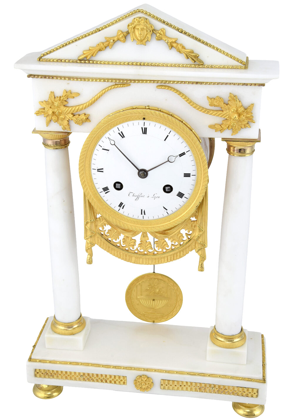 Zwischen diesen Stützen befindet sich das runde Zifferblatt, umgeben von einer vergoldeten Bronzelünette mit reich gravierten konzentrischen Friesen. Das makellose weiße Emaille-Zifferblatt ist mit schwarzen römischen Ziffern und fein durchbrochenen Zeigern verziert. Es trägt die Signatur „Thiaffait à Lyon“, eines Uhrmachers, der bereits 1810 in Tardys Wörterbuch der französischen Uhrmacher aufgeführt ist – ein Garant für Authentizität und uhrmacherische Qualität. Unterhalb des Zifferblatts erinnert ein zartes, durchbrochenes Gewand aus vergoldeter Bronze, mit exquisiter Finesse ausgeführt, an antike Wandteppiche und unterstreicht den theatralischen Charakter des Stücks. Im Zentrum schwebt ein fein gearbeitetes, linsenförmiges Pendel aus vergoldeter Bronze, das eine antike Blumenvase – ein Symbol für Fülle und Erneuerung – darstellt. Es verleiht der Komposition Anmut und Leichtigkeit und bildet gleichzeitig einen raffinierten Blickfang.