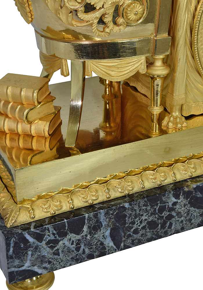 Modèle particulièrement bien proportionné à décor d’une jeune femme à la lecture habillée à la Grecque, assise dans un fauteuil finement ouvragée de palmettes, rinceaux, masque et de chute de draperie. Accoudée sur une table recouverte d’un très beau drapé terminé par des griffes de lion.