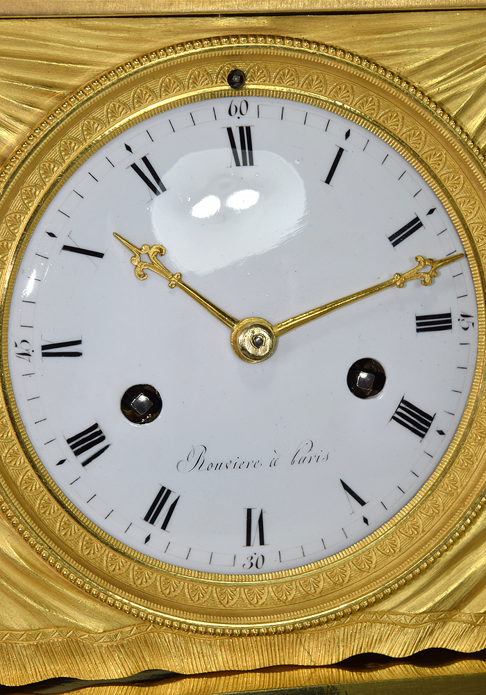 Rare pendule d’époque Empire signé « Rouvière à Paris » horloger référencé dans le Tardy, dictionnaire des horlogers français. Composé de bronze doré au mercure finement ciselé et d’une base en marbre vert de mer.