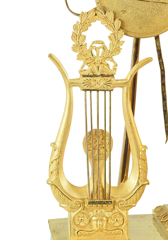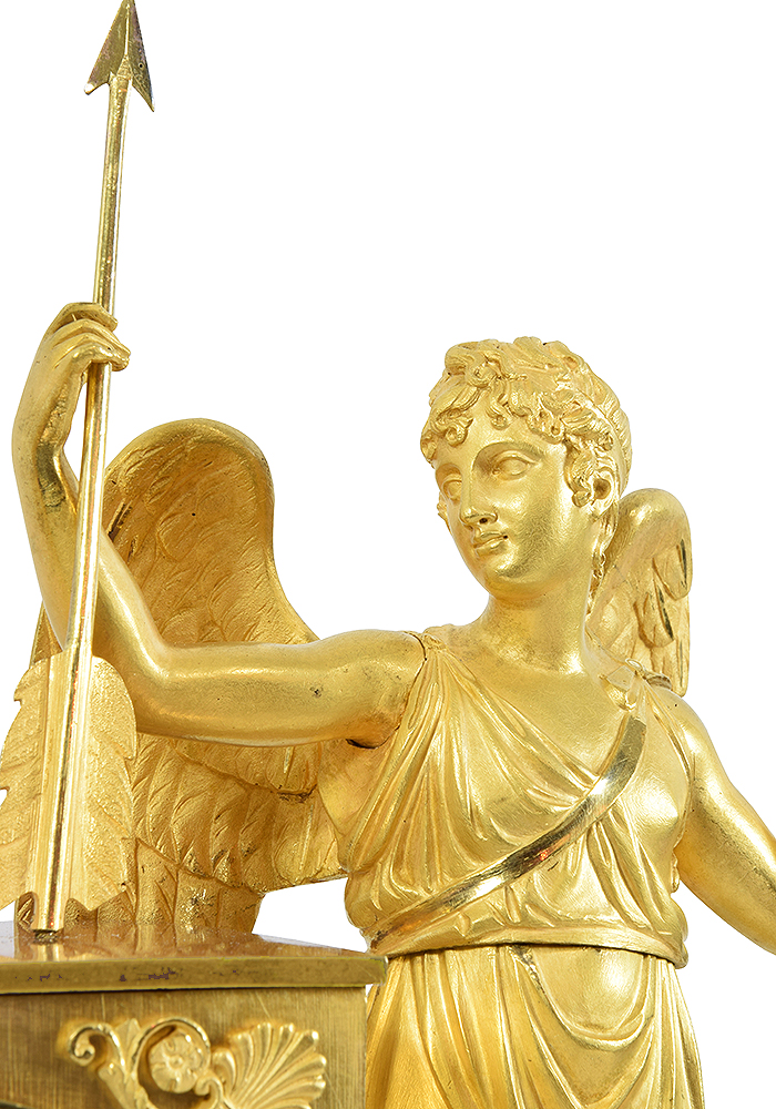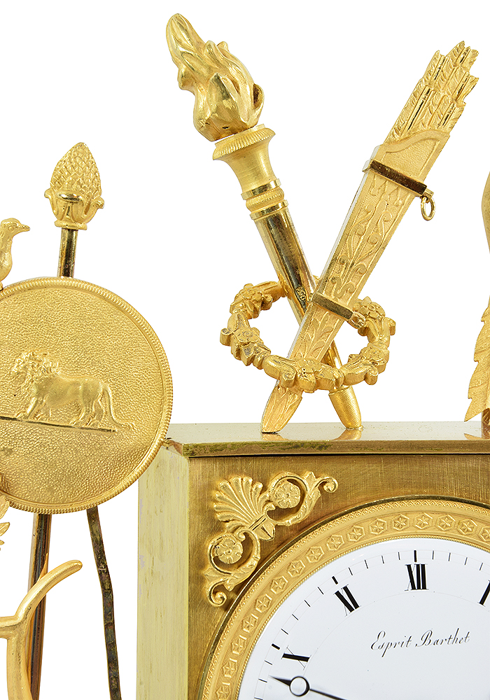 Intéressante pendule mythologique d’époque Empire signé « Esprit Barthet », horloger référencé dans le Tardy, dictionnaire des horlogers. Architecture en bronze doré au mercure, très belle qualité de la dorure et le bronze finement ciselé. Thème principal mythologique de Eros, Dieu de l’amour. représenter avec un large choix de ses attributs finement reproduit. Cadran bombé en émail blanc.