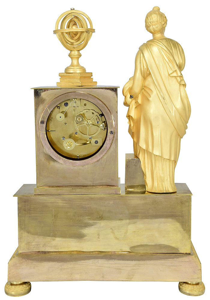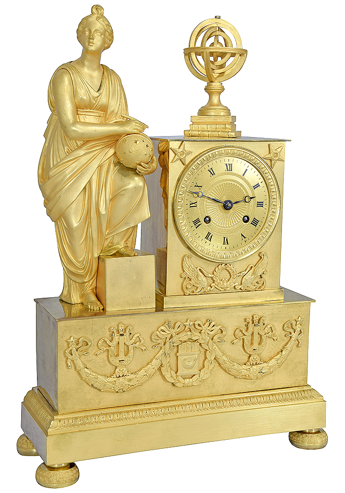 Modèle peu courant d’époque Restauration en bronze doré au mercure. Grande sculpture de la Muse Uranie, patronne de l’astronomie et de l’astrologie, tête et regard en direction du ciel, elle tient un globe céleste et une sphère armillaire posé sur des ouvrages. Cadran en bronze, base rectangulaire orné de guirlandes enrubannées, d’une couronne et de lyres.