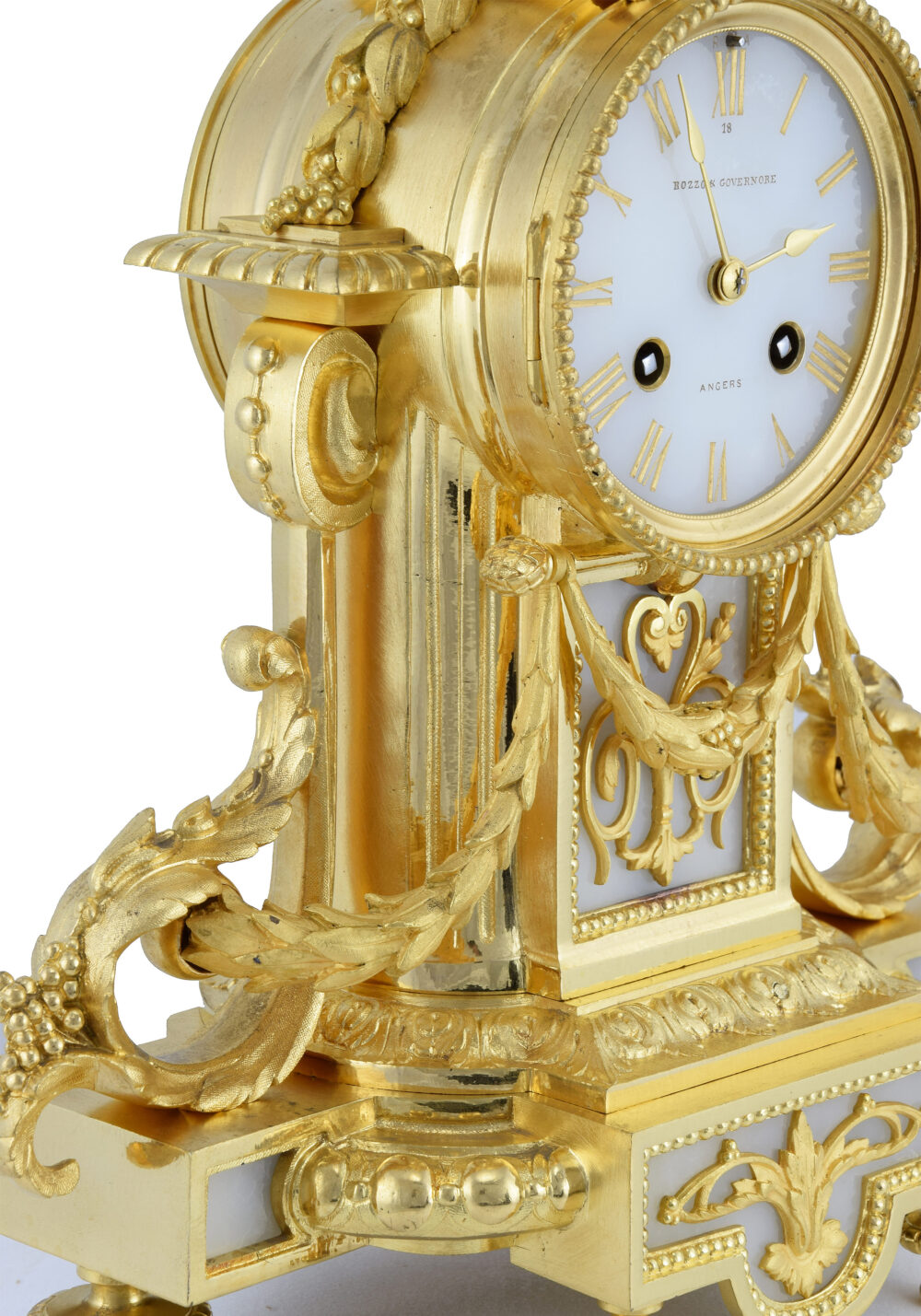 Pendule de style Louis XVI, d’époque Napoléon III vers 1860 signé sur le cadran et mécanisme “Bozzo Governore à Angers” horloger référencé dans le Tardy, dictionnaire des horlogers à la date de 1850. Entièrement réalisée en bronze doré à l’or associé à des plaques en pierre blanche, onyx.