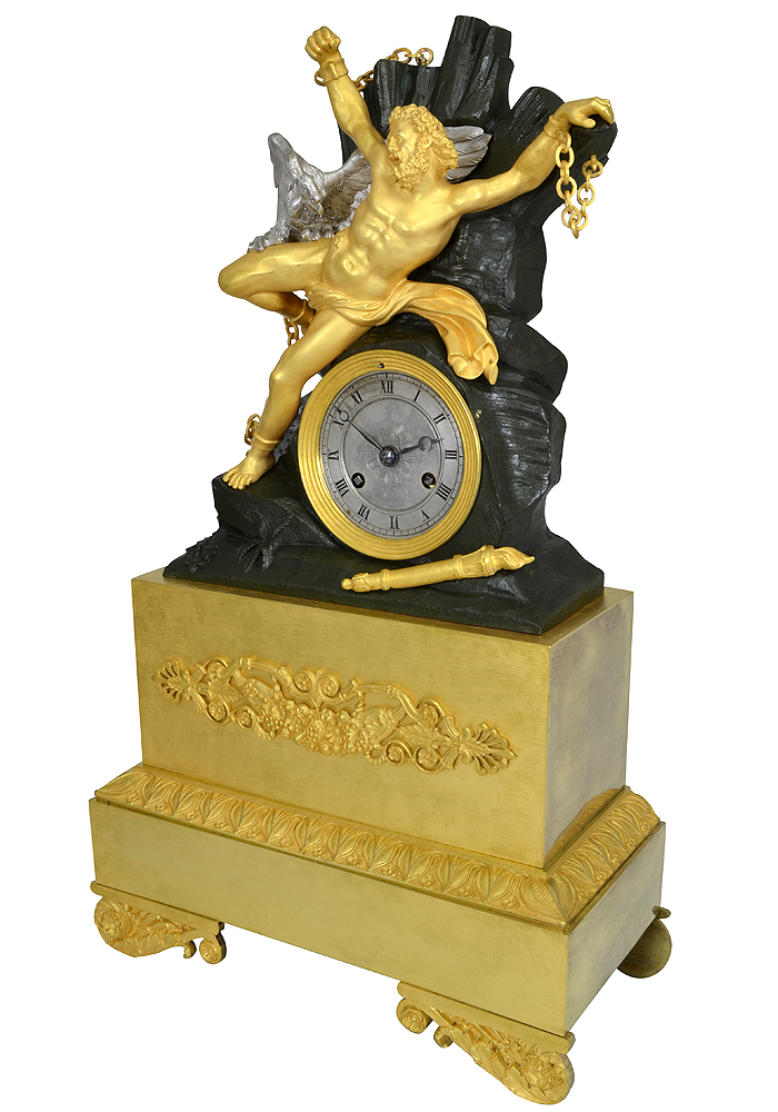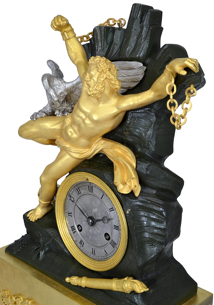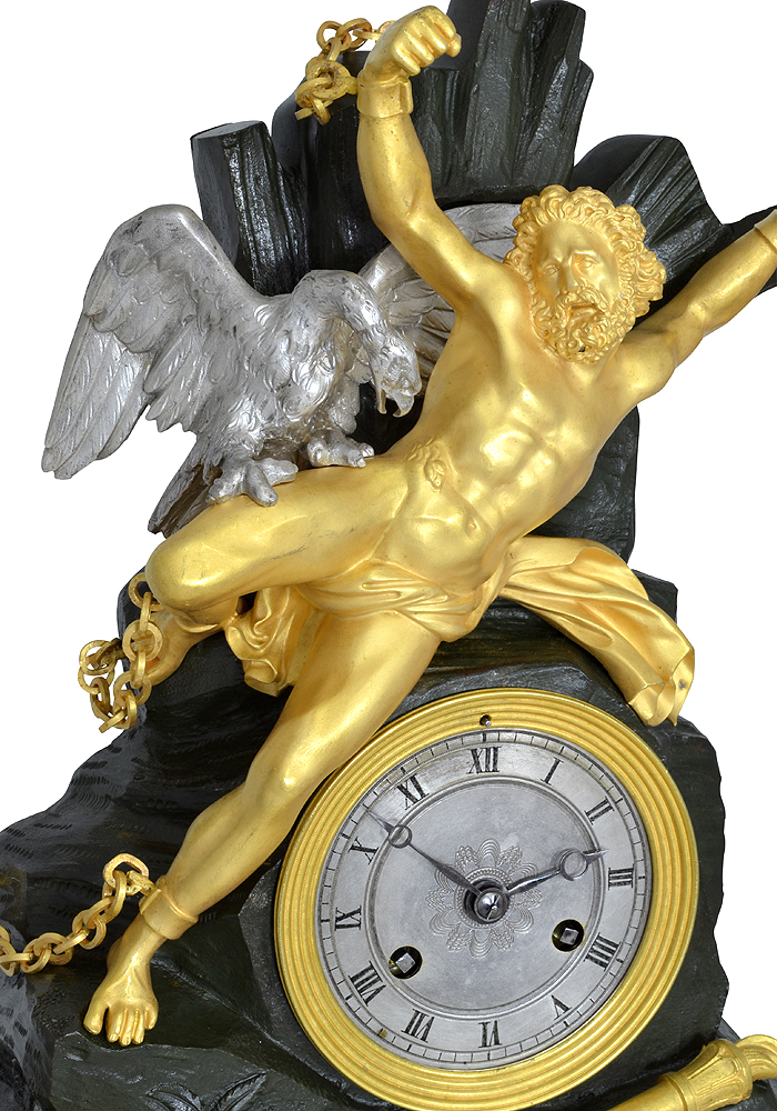 Rare Pendule d’époque Restauration vers 1820. Très belle scène mythologique de Prométhée (bronze doré au mercure) condamné par Zeus à être attaché à un rocher (bronze patiné vert) sur le mont Caucase et d’un l’aigle en bronze argenté qui dévore son foie cette punition est infligé pour le vol du « savoir divin » (le feu sacré de l’Olympe) et restitue aux humains.