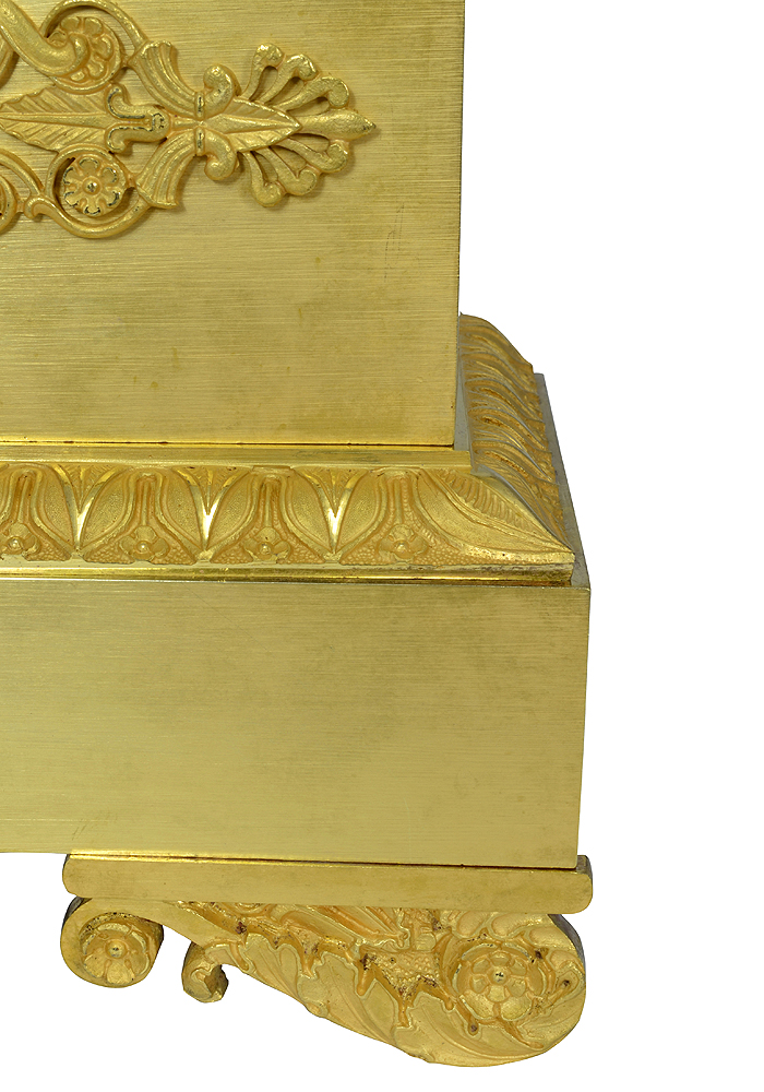 Cadran en bronze argenté souligné par un entourage ciselé en bronze doré au mercure. Base en bronze doré au mercure à décor de palmettes, guirlandes, rosaces.