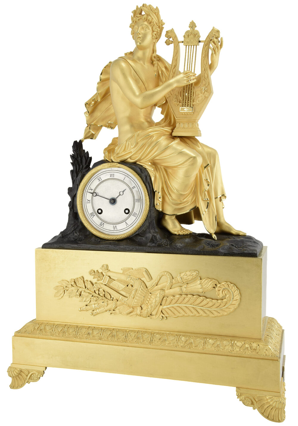Diese bemerkenswerte Uhr besticht durch ihre skulpturale Komposition von seltener Ausdruckskraft. Majestätisch auf einem Felsensockel thronend, ist Apollo, Gott der Künste und des Lichts, in einer heiteren und inspirierten Pose dargestellt, die Leier anmutig haltend. Sein mit großer anatomischer Finesse gestalteter Körper entfaltet sich in einer eleganten, zugleich entspannten und majestätischen Haltung. Das Gesicht mit seinen idealisierten Zügen drückt eine ruhige spirituelle Erhabenheit aus, während der Blick auf eine höhere Harmonie gerichtet scheint. Die Skulptur bildet hier das Wesen der Uhr: Sie zieht die Blicke mit souveräner Präsenz auf sich, ohne überflüssige Verzierungen zu benötigen. Die Bearbeitung der quecksilbervergoldeten Bronze offenbart eine außergewöhnliche Ausführungsqualität, insbesondere in der Modellierung des Fleisches, dem fließenden Fall der Gewänder und der Präzision der Details. Der tief gemeißelte und plastisch hervorgehobene Lorbeerkranz betont das Haupt des Gottes und unterstreicht seinen Sieg und sein Genie.