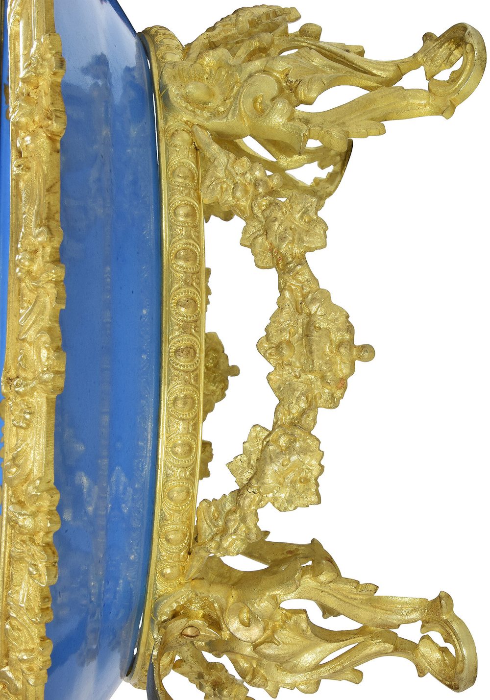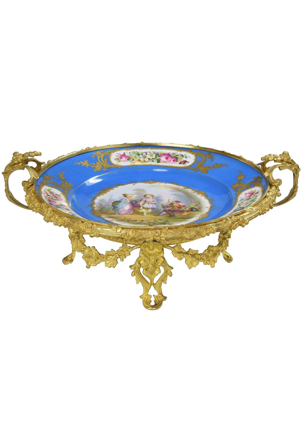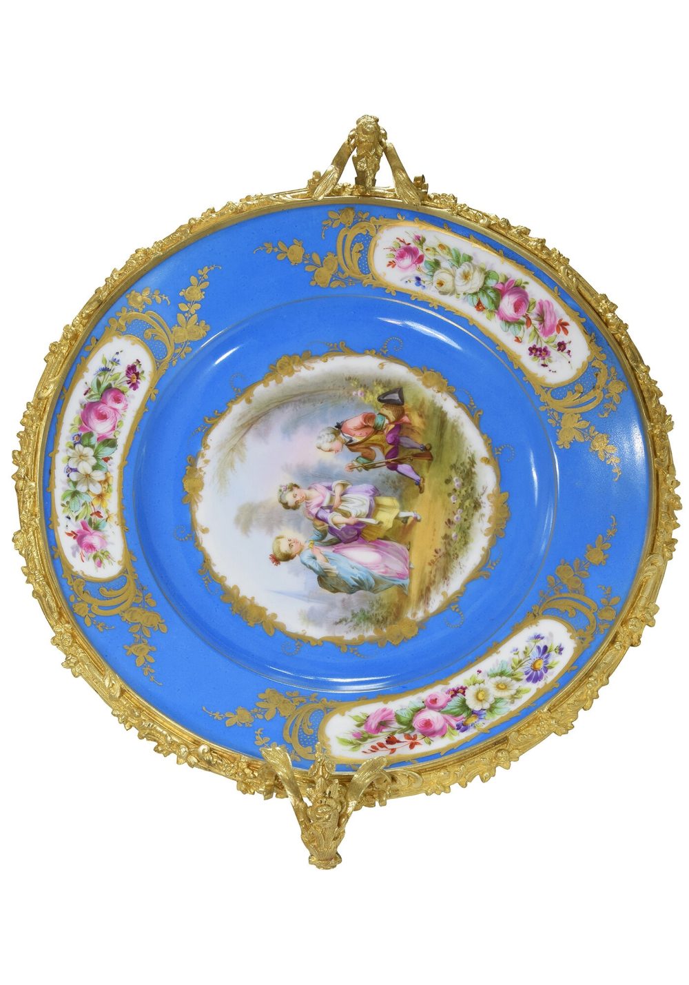 Sehr dekorativ und von schönem Volumen. Zeit Napoleons III., große dicke Porzellanplatte. Hellblauer Hintergrund, fein verziert mit farbenfrohen, mit Blumen geschmückten Gemälden und in der Mitte eine Szene mit der Figur dreier High Society-Figuren. Jedes Gemälde ist von Goldmotiven umrahmt. Fein gemeißelter vergoldeter Bronzerahmen mit sehr schöner, mit Girlanden verzierter Vergoldung.