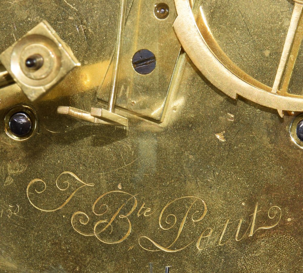 Sehr hochwertige, große Portaluhr. Anfang des 19. Jahrhunderts signiert auf dem Zifferblatt „L.B Petit“ Uhrmacher, auf den im Tardy, Wörterbuch der Uhrmacher, verwiesen wird. Architektur in dickem und sehr nuanciertem Mahagonifurnier, das Ganze hat von einem Pufferlack profitiert, der Glanz, Kontrast und Schutz bringt. Sehr großes, gewölbtes weißes Emailzifferblatt, unterstrichen von einem dicken, mit Blumen fein gemeißelten Umriss aus Bronze. Ornament aus fein ziselierten Bronzen, sie sind mit Quecksilbervergoldung in Mattgold überzogen.