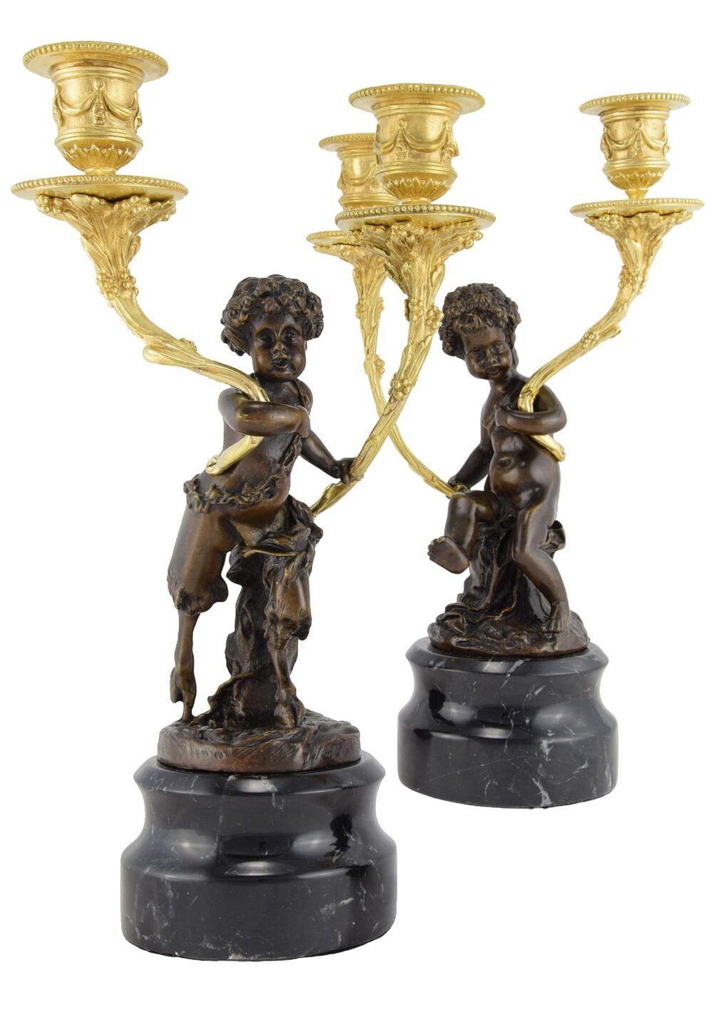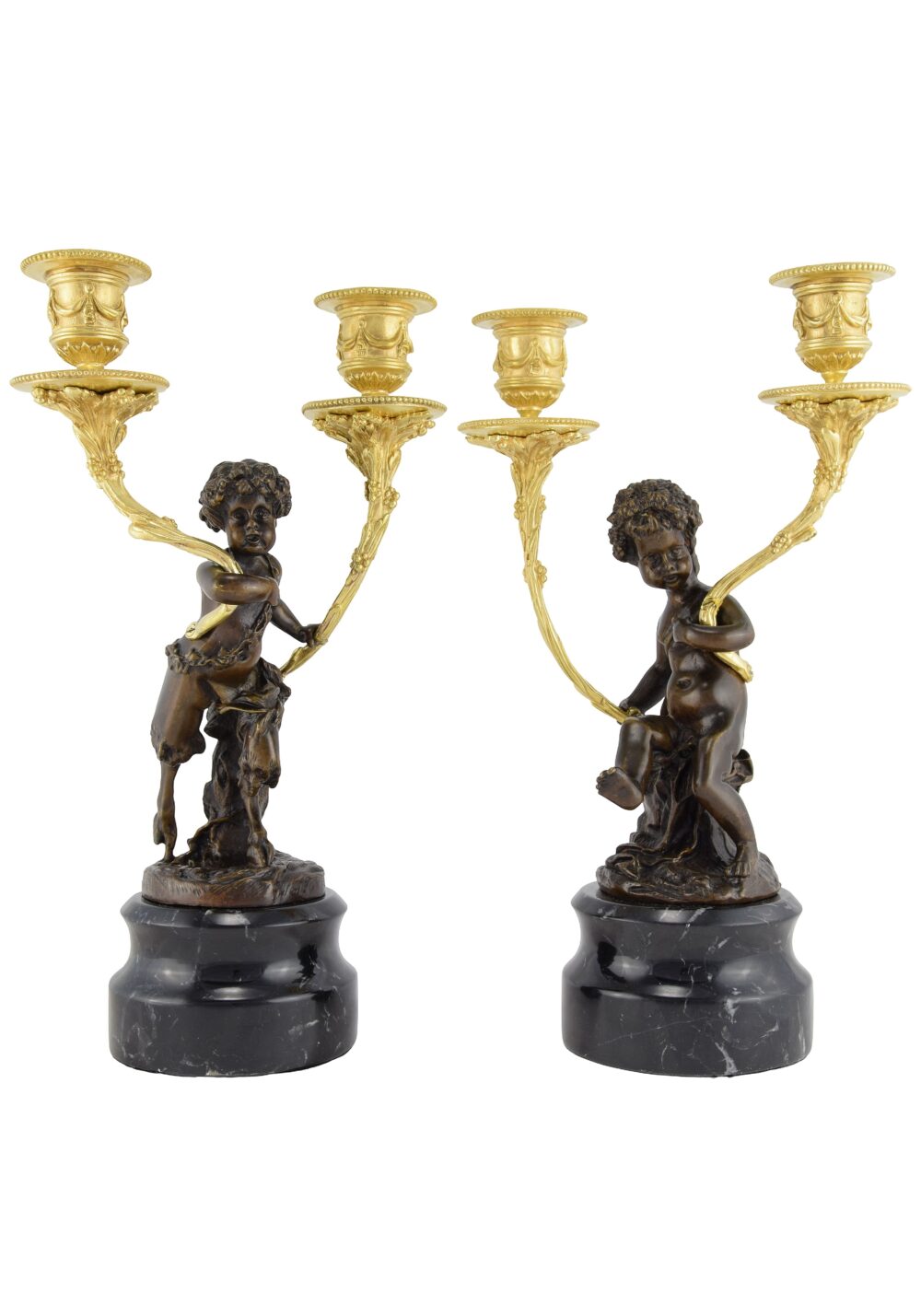 Très décorative paire de chandeliers d’époque Napoléon III. En bronze patiné, sculpture très en relief à figure d’un faune et d’une nymphe, portant de chaque bras, un bras de lumière en bronze doré. Chaque porte-bougie est équipé d’une protection de cire d’origine et amovible. Base massive en marbre noir veiné.