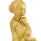 Eine reich gekleidete Frauenfigur, inspiriert von der Eleganz der Renaissance im Stil des 16. Jahrhunderts. In ein Gewand mit üppigen, kunstvoll gearbeiteten Falten gehüllt, nimmt sie eine anmutige, nachdenkliche Pose ein. Sie hält einen Brief in einer schwebenden Geste, als sei sie beim Lesen oder im Moment der Antwort ertappt – eine subtile Allegorie auf Korrespondenz, Intellekt oder diskrete Liebe. Ihr heiteres Gesicht mit seinen idealisierten Zügen wird von einem fein verzierten Kopfschmuck umrahmt, während die Ausführung des Kostüms bemerkenswerte Handwerkskunst offenbart: Stickereien, Borten, florale Motive und Textilstrukturen sind mit außergewöhnlicher Präzision wiedergegeben.