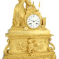 Diese bemerkenswerte Uhr aus der Louis-Philippe-Zeit (um 1850–1860) spiegelt den historistischen Geschmack des 19. Jahrhunderts wider und ist von der Ästhetik der Renaissance inspiriert. Sie entfaltet eine intime und zugleich gelehrte Szenerie, in der die vergoldete Bronzearchitektur den Rahmen für eine poetische Beschwörung von Wissen, Schrift und Kunst bildet.