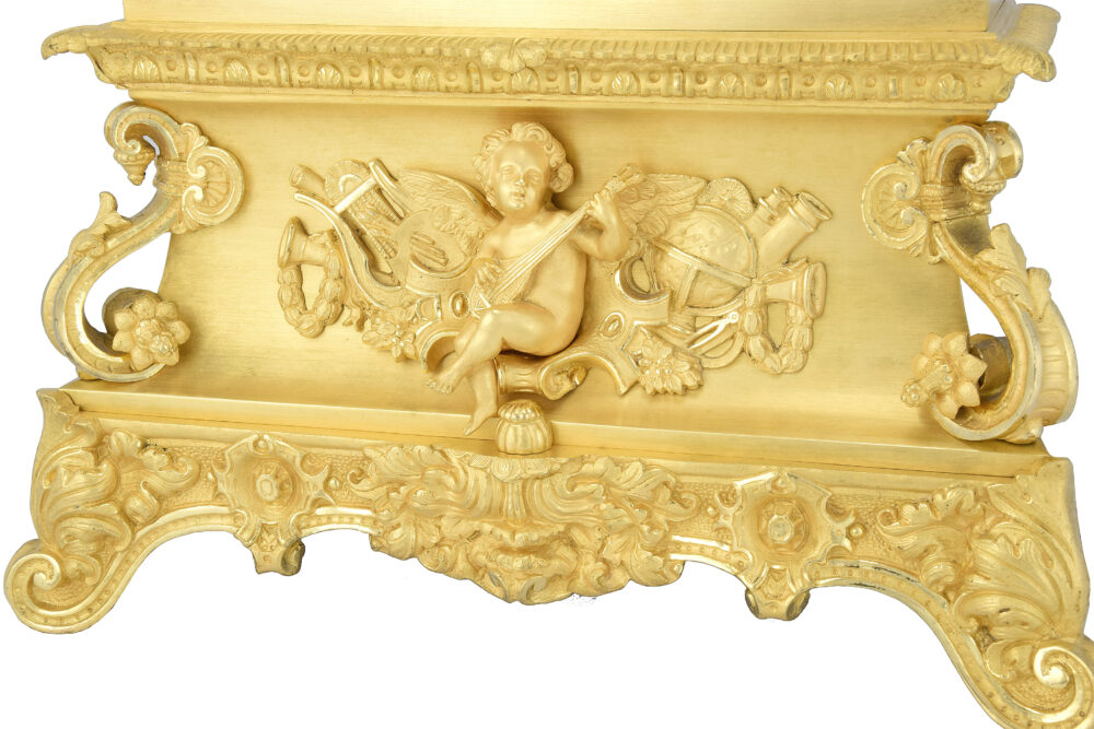 Im unteren Bereich ruht die Uhr auf einem fließenden Sockel mit üppigen Voluten, akzentuiert durch volutenförmige Konsolen und reich modellierte Pflanzenornamente. Ein fein modellierter, geflügelter Putto, der im Zentrum einer dekorativen Trophäe sitzt, spielt ein Saiteninstrument. Er ist umgeben von gelehrten Attributen – Globen, Büchern, Instrumenten –, die eine Allegorie der Künste und Wissenschaften bilden. Diese untere Bildebene tritt in einen Dialog mit der oberen Szene und schafft so eine thematische Kontinuität zwischen Musik, Studium und Schreiben.