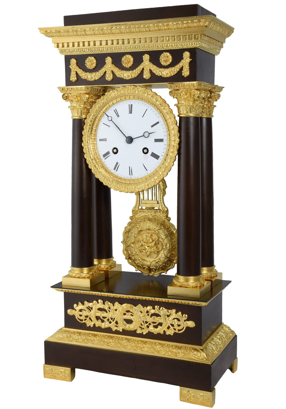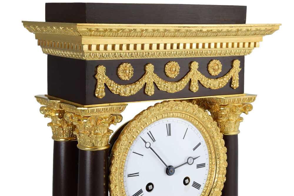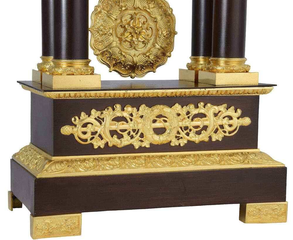 Eine Portikusuhr aus der Restaurationszeit, gefertigt aus quecksilbervergoldeter und patinierter Bronze, ruht auf einem monumentalen, von der Antike inspirierten Bauwerk. Die gesamte Komposition erinnert an einen kleinen Tempel und wird von vier zylindrischen Säulen aus dunkelbraun patinierter Bronze getragen, die in einem Portikus angeordnet sind und auf fein ziselierten, vergoldeten quadratischen Bronzesockeln ruhen. Die reich verzierten, korinthisch inspirierten Kapitelle weisen eine Fülle von Akanthusblättern und Voluten auf und tragen ein vorspringendes Gebälk, das wie ein klassisches Kranzgesims gestaltet ist.