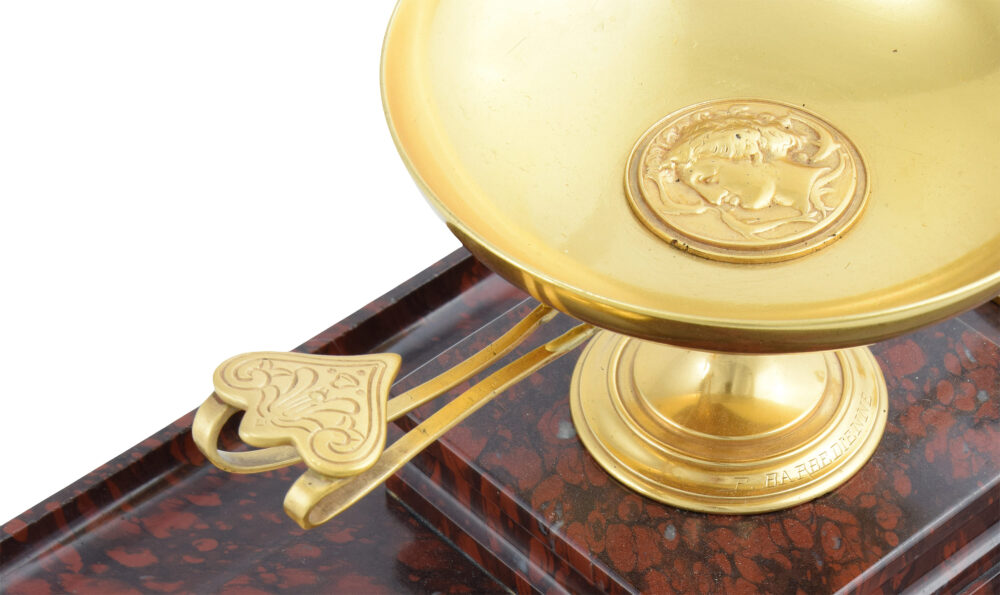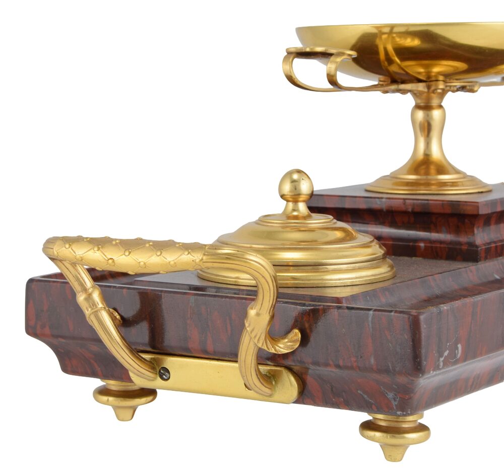 Magnifique encrier dans le style Néo-Classique constitué d’un plateau en marbre massif de couleur rouge griotte accueillant deux encriers circulaires et d’une coupe à l’antique ornementé d’un profil féminin en bronze doré. L’encrier est équipé d’anses finement guilloché. Il est estampillé de la manufacture du fondeur à deux endroits, l’un sur le piédouche de la coupe et l’autre à l’intérieur d’un encrier. Époque Napoléon III.
