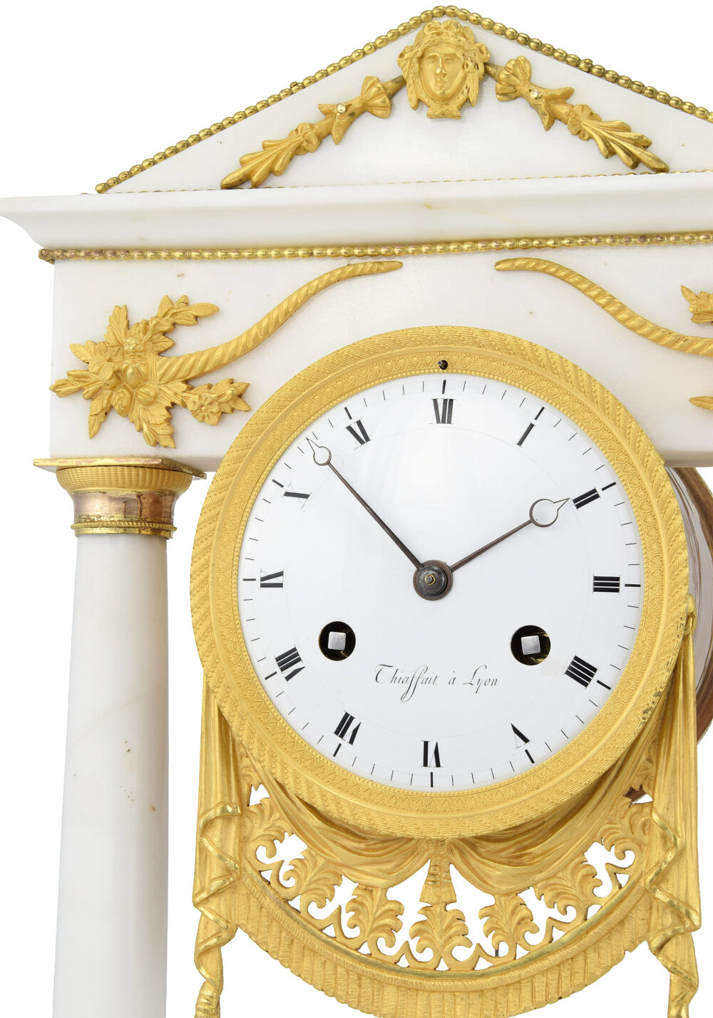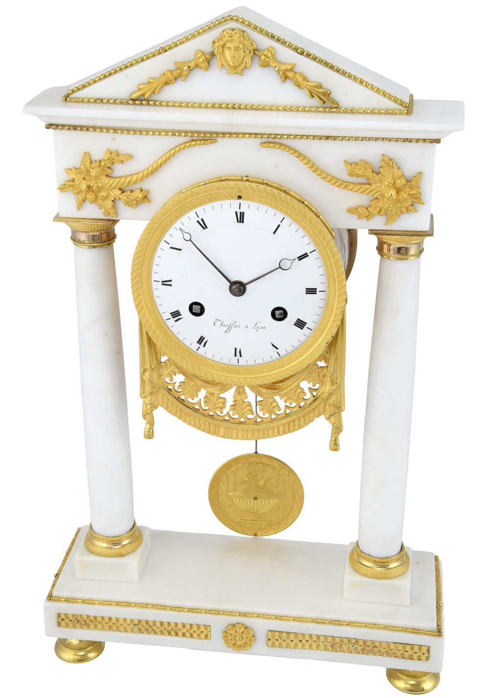 Zwischen diesen Stützen befindet sich das runde Zifferblatt, umgeben von einer vergoldeten Bronzelünette mit reich gravierten konzentrischen Friesen. Das makellose weiße Emaille-Zifferblatt ist mit schwarzen römischen Ziffern und fein durchbrochenen Zeigern verziert. Es trägt die Signatur „Thiaffait à Lyon“, eines Uhrmachers, der bereits 1810 in Tardys Wörterbuch der französischen Uhrmacher aufgeführt ist – ein Garant für Authentizität und uhrmacherische Qualität. Unterhalb des Zifferblatts erinnert ein zartes, durchbrochenes Gewand aus vergoldeter Bronze, mit exquisiter Finesse ausgeführt, an antike Wandteppiche und unterstreicht den theatralischen Charakter des Stücks. Im Zentrum schwebt ein fein gearbeitetes, linsenförmiges Pendel aus vergoldeter Bronze, das eine antike Blumenvase – ein Symbol für Fülle und Erneuerung – darstellt. Es verleiht der Komposition Anmut und Leichtigkeit und bildet gleichzeitig einen raffinierten Blickfang.