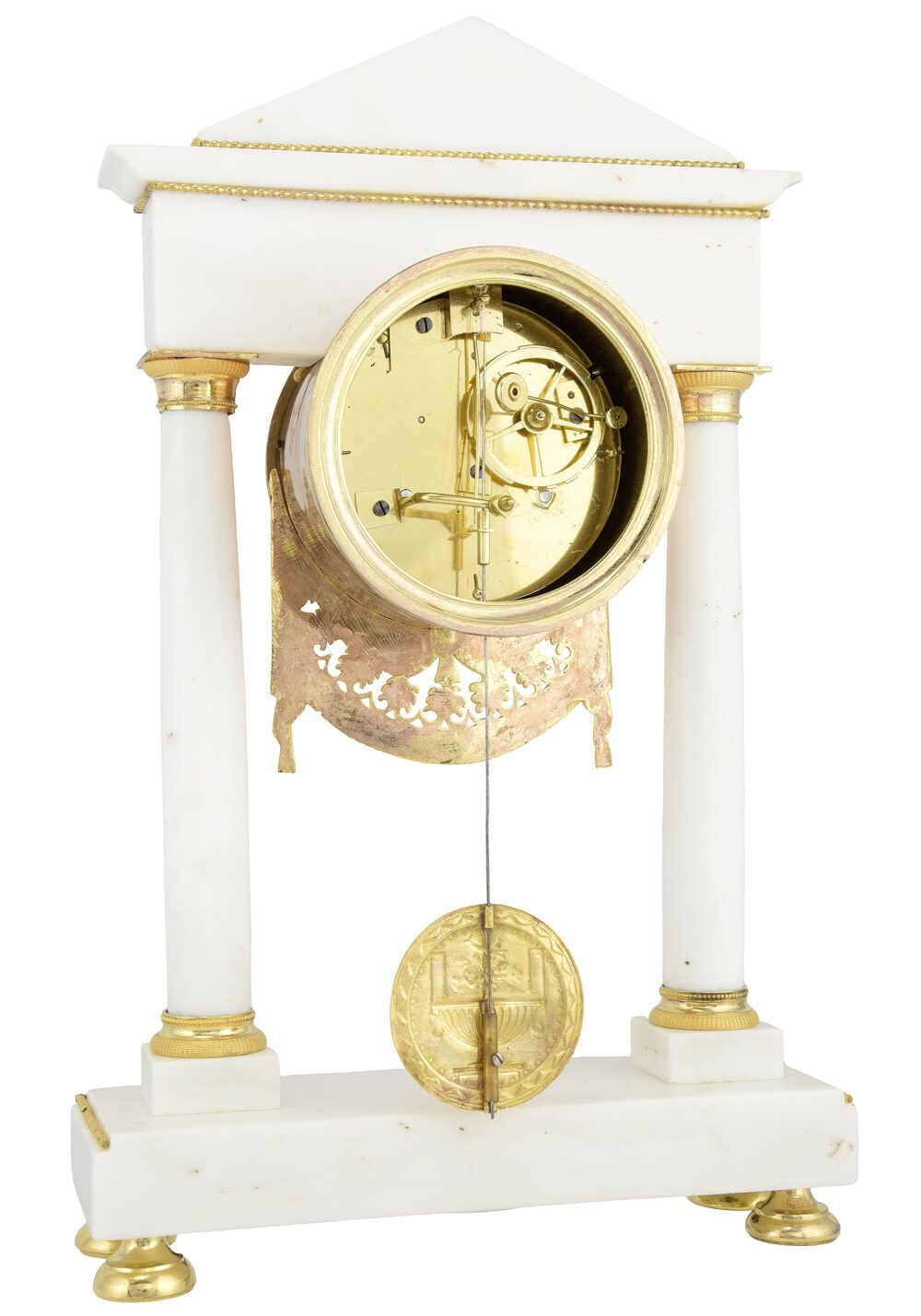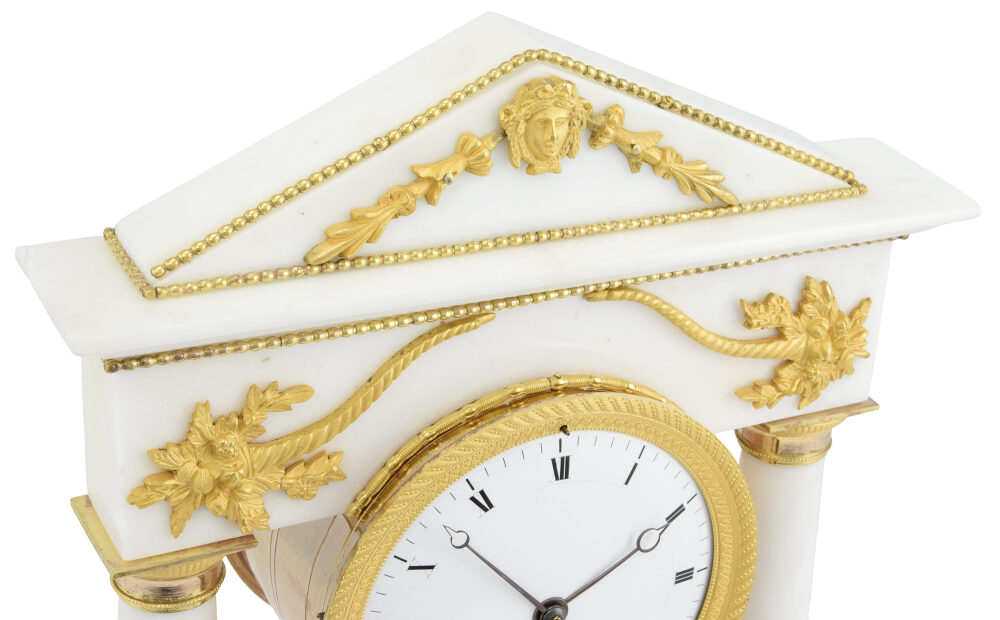 Diese Portikusuhr, die an die Fassade eines antiken Tempels aus der Kaiserzeit erinnert, besticht durch die edlen Materialien und die außergewöhnliche Feinheit ihrer Schnitzereien. Gefertigt aus makellosem weißen Marmor und verziert mit hochwertigen, quecksilbervergoldeten Bronzebeschlägen, verkörpert sie auf brillante Weise den von der Antike inspirierten neoklassizistischen Stil.