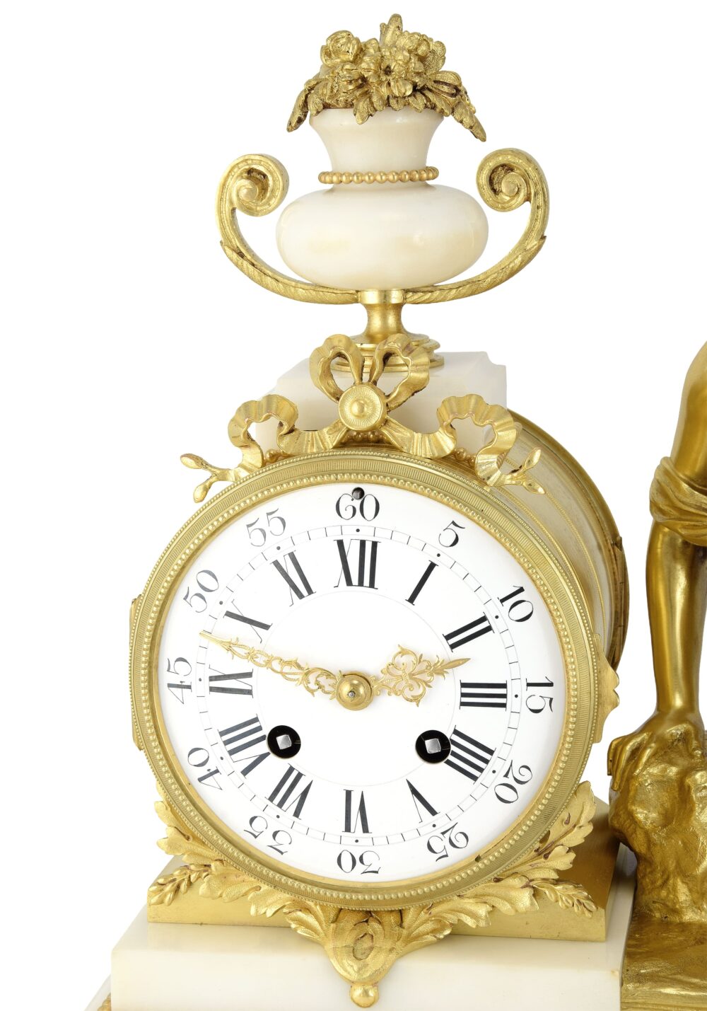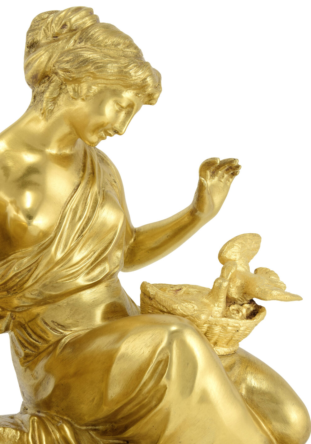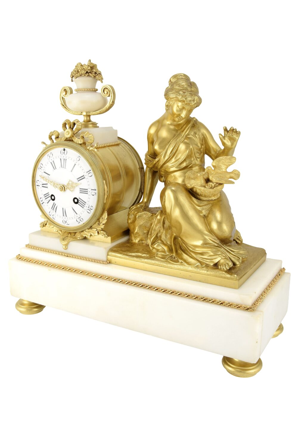 Rechts neben dem Uhrwerk befindet sich eine fein vergoldete weibliche Bronzefigur, das eigentliche Ausdrucksmittel des Kunstwerks. In anmutiger und nachdenklicher Pose dargestellt, verkörpert sie eine Allegorie von Sanftmut und Poesie. Das im klassischen Stil drapierte Gewand offenbart ein subtiles Zusammenspiel geschmeidiger Falten, die den Körper naturalistisch umhüllen und die hohe Qualität des Gusses und der Ziselierung unterstreichen. Ihr leicht geneigter Oberkörper und der gesenkte Blick vermitteln einen nachdenklichen, fast mütterlichen Ausdruck, der durch die zarte Geste ihrer erhobenen Hand verstärkt wird. Die junge Frau beugt sich zu einem Nest mit Jungvögeln, ein symbolisches Motiv, das Schutz, Erneuerung oder den Kreislauf der Zeit evoziert – ein Thema, das sich besonders gut für eine Uhr eignet. Die ruhige und beschützende Haltung der Figur verleiht der Szene eine intime, erzählerische Dimension und bildet einen Kontrast zur architektonischen Strenge von Sockel und Zifferblatt. Die Modellierung des Gesichts mit seinen weichen, idealisierten Zügen sowie die fließende Darstellung des geknoteten Haares zeugen von einem neoklassizistischen Einfluss, der in der dekorativen Skulptur der Mitte des 19. Jahrhunderts noch deutlich spürbar war.