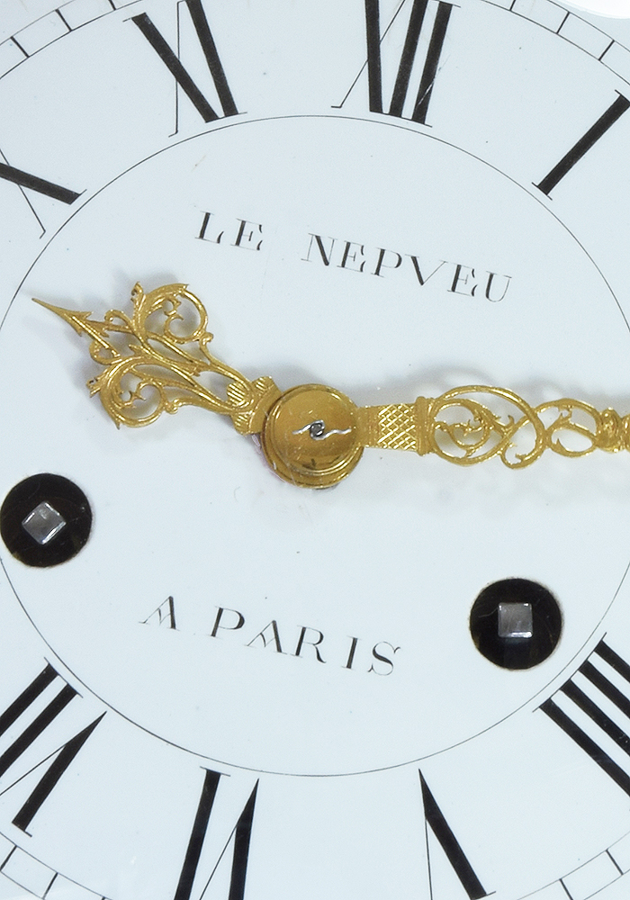 The clock’s movement undergoes a complete overhaul; it is totally dismantled, cleaned and each individual part is polished. The duration of this procedure affects the shine: we prefer to obtain a brilliant shine, in keeping with the gilding of the object. To increase the strength and quality of the gears, we apply a very important procedure, known as bouchonnage, to correct for wear accumulated over years of operation, consisting in the placing cork of stoppers in any pivot holes that have become deformed by wear. After the clock has been completely reassembled, it is tested over a long period of time to ensure that the movement, as well as the hour and half-hour strikes, are operating correctly.