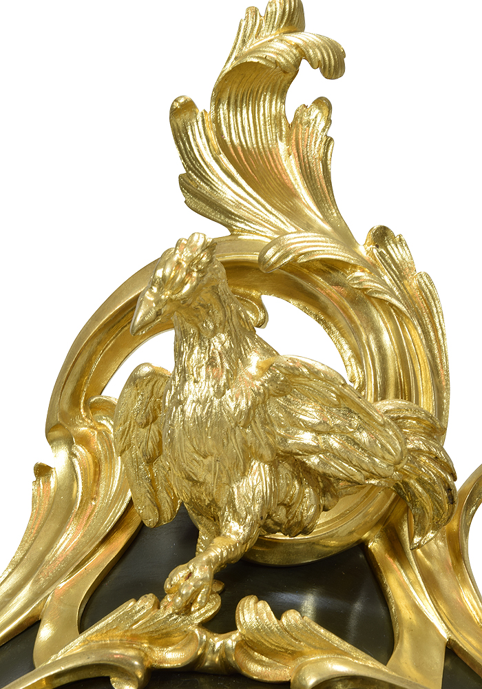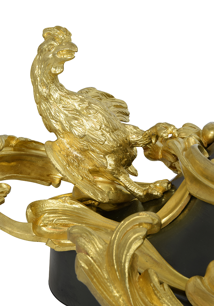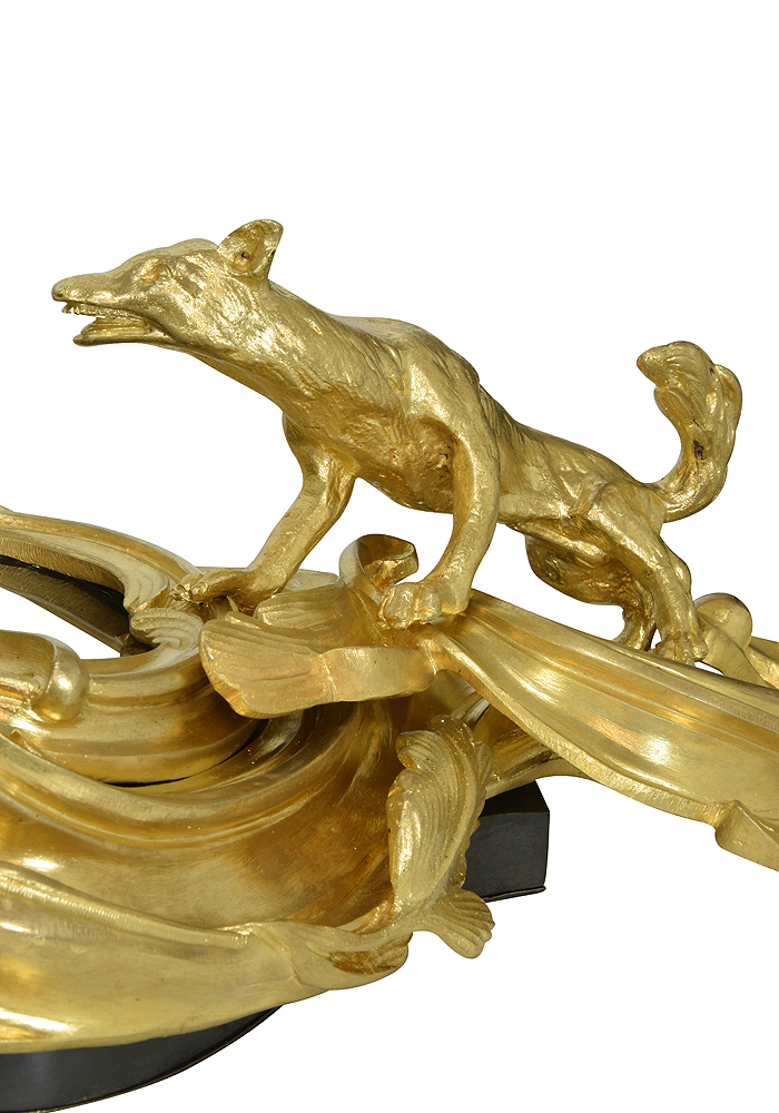Base en bronze patiné et d’une ornementation à riche décor de feuillages mouvementés en bronze doré finement ciselé à décor d’un coq et d’un renard sur le thème des Fables de La Fontaine.