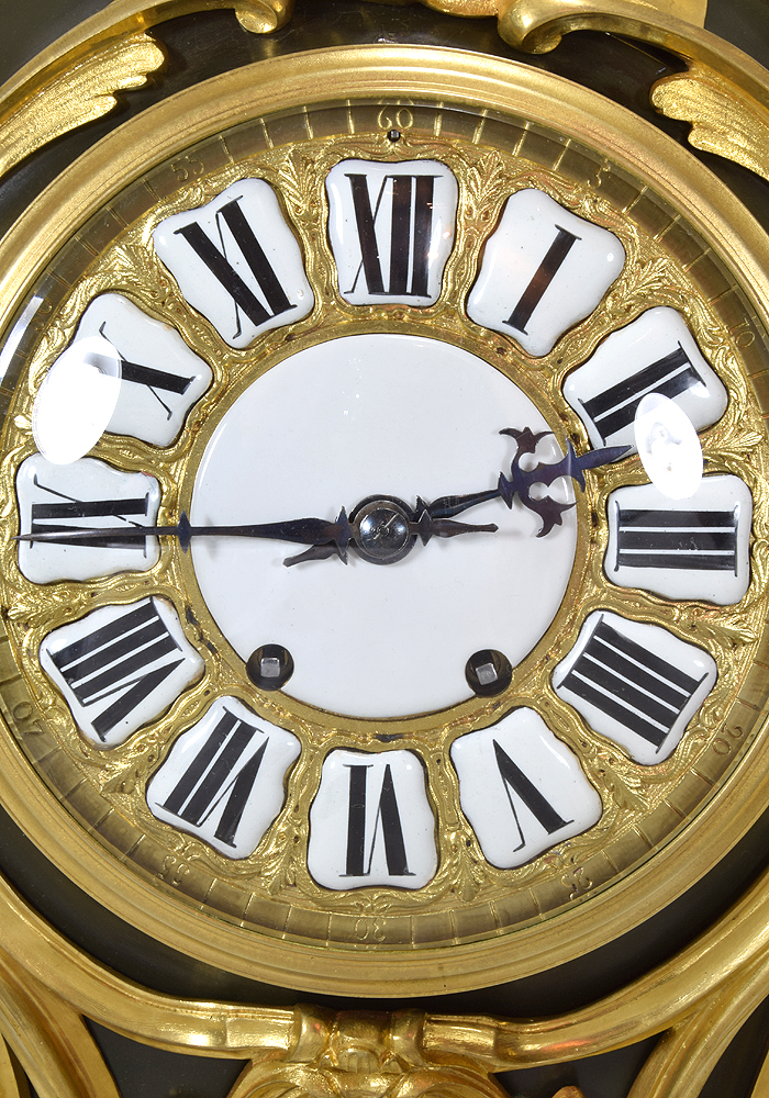 Large cadran en bronze ciselé à treize cartouches émaillées, l’ensemble protégé par un verre bombé.