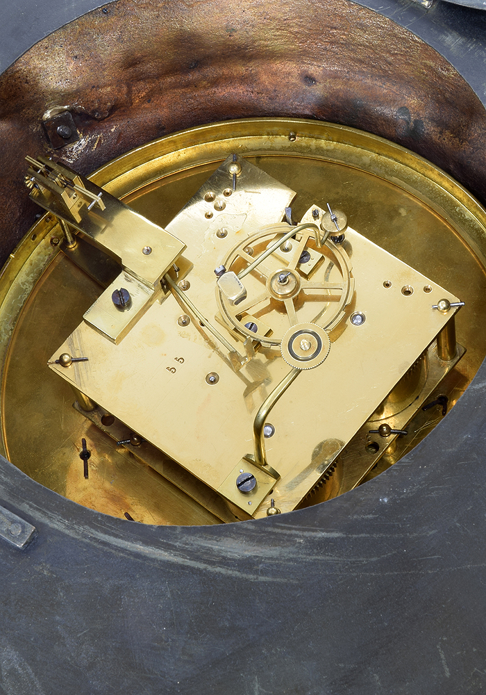 The clock’s movement undergoes a complete overhaul; it is totally dismantled, cleaned and each individual part is polished. The duration of this procedure affects the shine: we prefer to obtain a brilliant shine, in keeping with the gilding of the object. To increase the strength and quality of the gears, we apply a very important procedure, known as bouchonnage, to correct for wear accumulated over years of operation, consisting in the placing cork of stoppers in any pivot holes that have become deformed by wear. After the clock has been completely reassembled, it is tested over a long period of time to ensure that the movement, as well as the hour and half-hour strikes, are operating correctly.