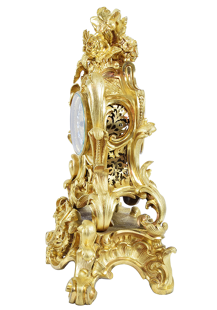 Très jolie pendule de type cartel sur son socle solidaire, dans le style Louis XV d’époque Napoléon III. En bronze doré finement ciselé, architecture mouvementée à décor de rinceaux. Agrémenté de parties ajourées, recouvert de plaques ciselées de motifs de végétaux. Cadran en bronze serti de douze cartouches émaillées, ensemble protégé par une lunette équipée d’un verre biseauté.