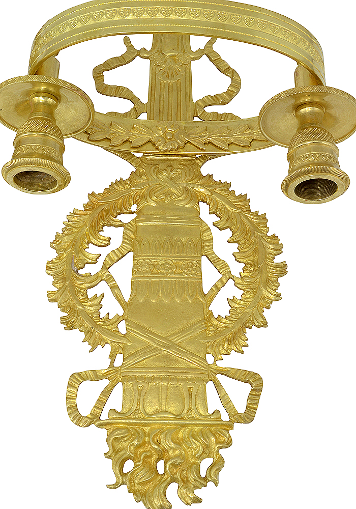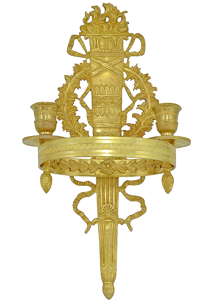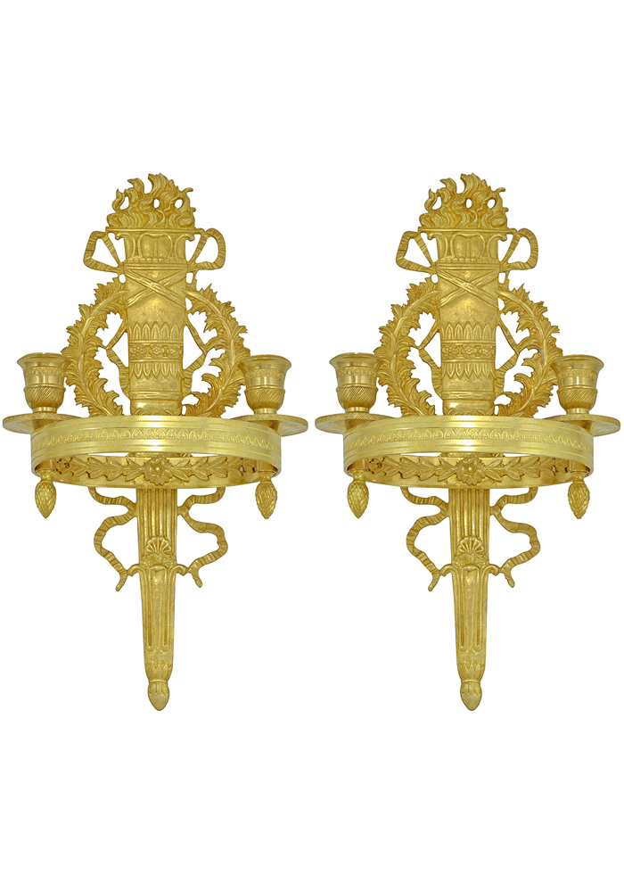 Superbe paire d’appliques à deux feux de style Empire en bronze doré. La partie centrale reprend un flambeau enrubanné et couronné, il supporte un ruban ovale ciselé de palmettes portant aux extrémités le porte-bougie. D’époque Napoléon III.