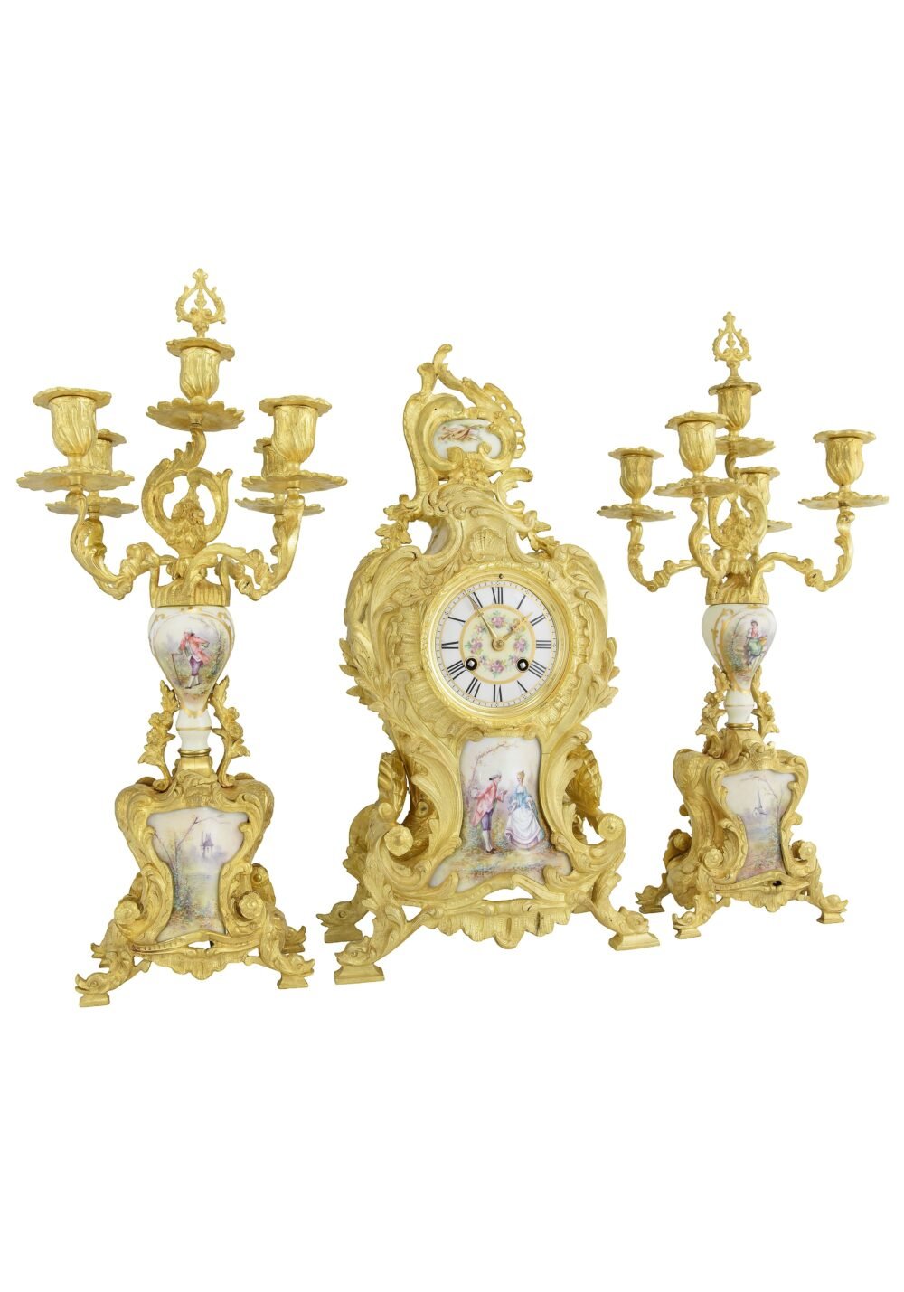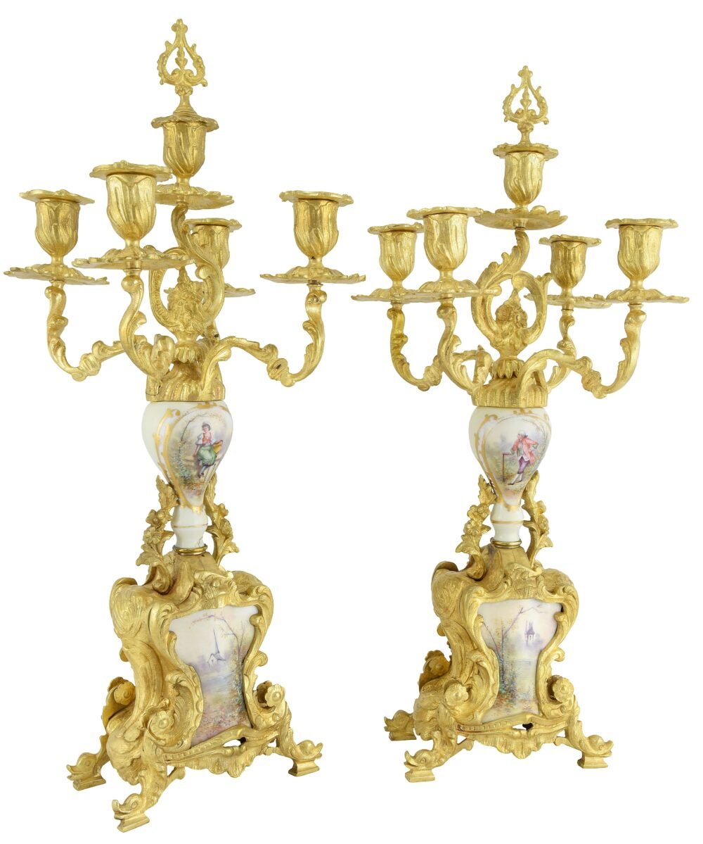 Highly decorative and of exceptional craftsmanship, this set forms a complete Louis XV style candlestick suite, made during the reign of Napoleon III, around 1860. Its dynamic design, crafted from finely gilded bronze, is distinguished by rich chasing of delicately worked foliage. The decoration is enhanced by white-ground Paris porcelain elements, adorned with refined polychrome painting depicting gallant scenes, landscapes, musical instruments, and figures.