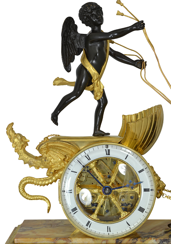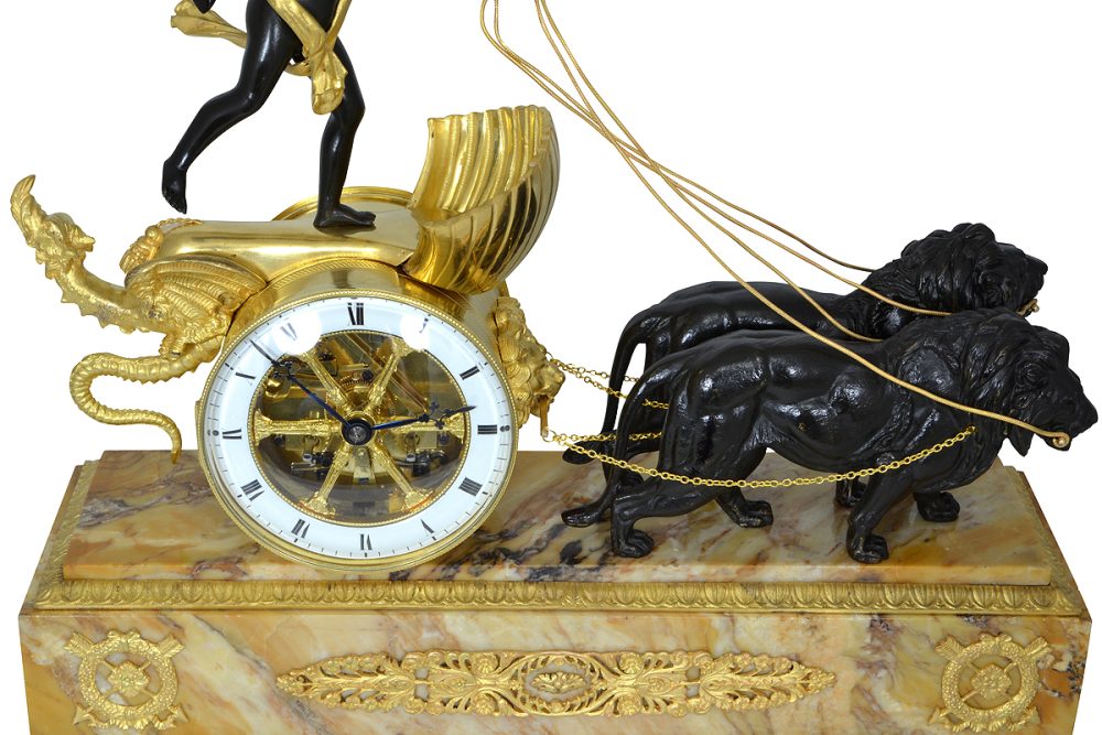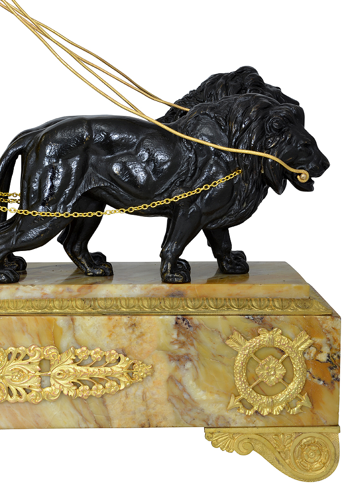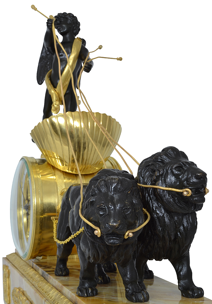 Rare pendule d’époque Second-empire vers 1855 en bronze doré et bronze patiné sur une large base en marbre sienne. Belle représentation d’un char à l’antique décoré d’un dragon et d’une tête de lion tenant l’attelage des deux lions dégage férocité et puissance dont la sculpture de la musculature est très réussite. Mouvement squelette reprenant la roue du char, cadran en émail blanc, la partie centrale à rayon et ajouré laisse apercevoir le mécanisme.