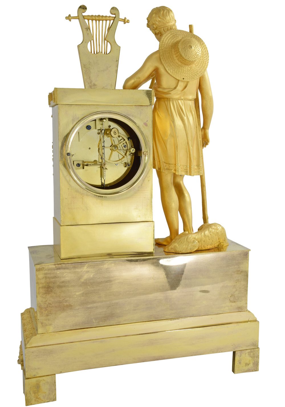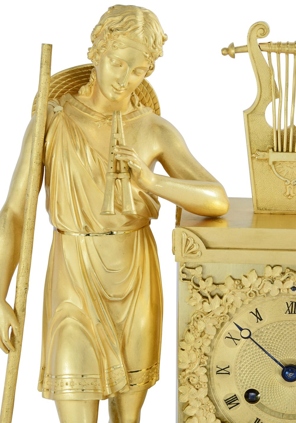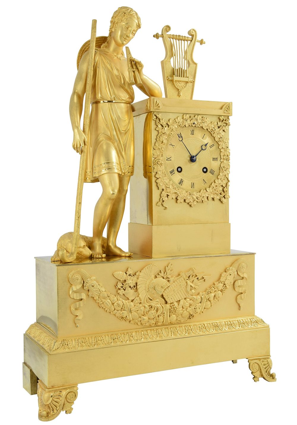 Grande pendule mythologique de très belle qualité d’époque Restauration vers 1820. Architecture en bronze recouverte d’une très belle dorure au mercure à l’or. Le grand personnage représente le prince et berger Pâris jouant du aulos, équipé d’un bâton et d’un chapeau. Cadran en bronze incrusté dans une borne dont le contour est finement travaillé de feuille de lierre, au sommet repose une très belle lyre.