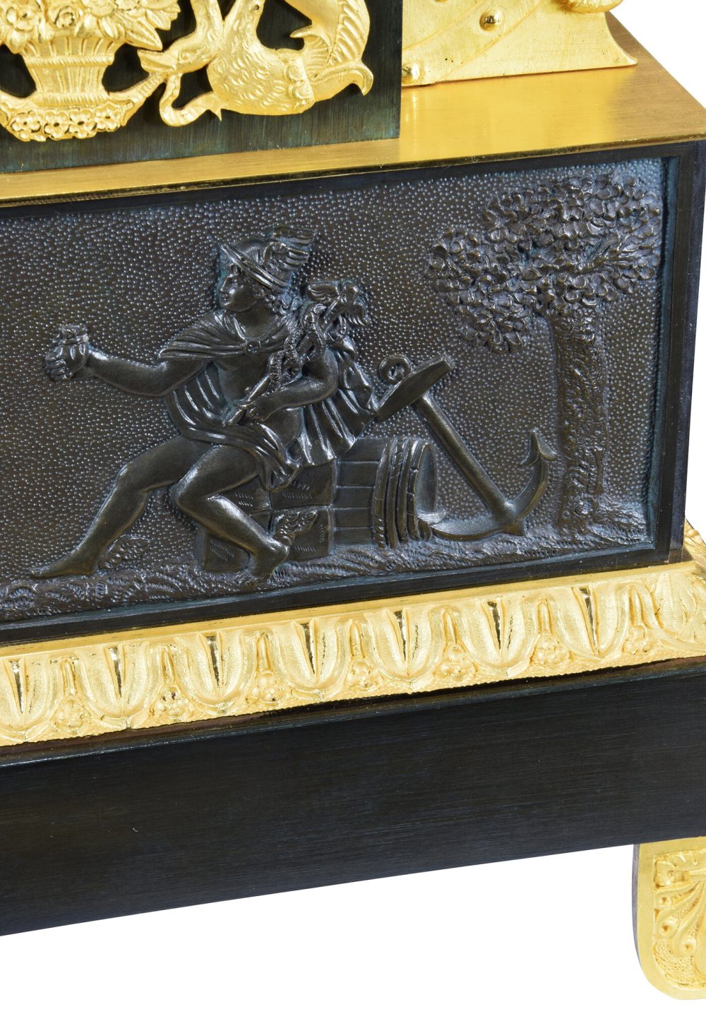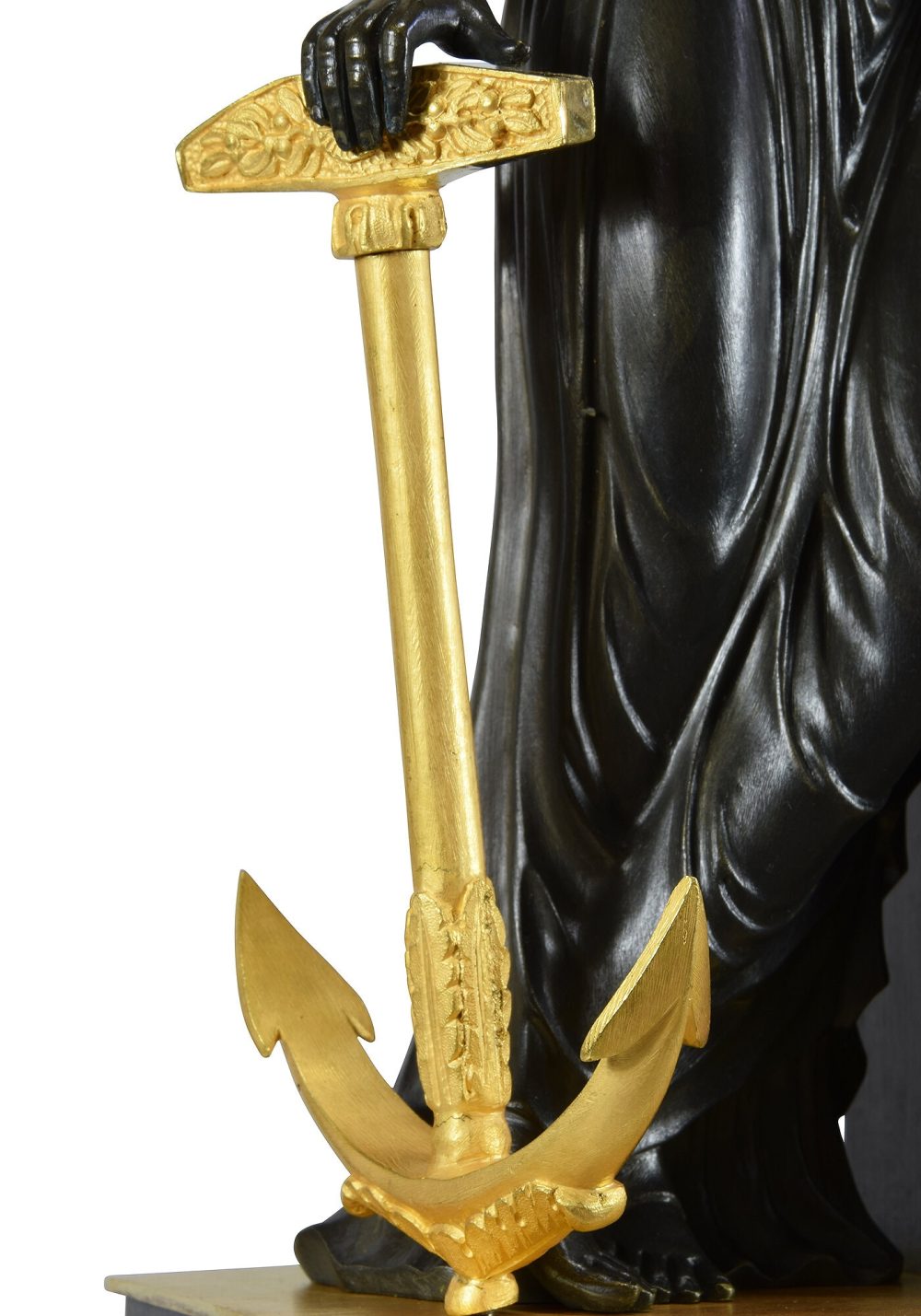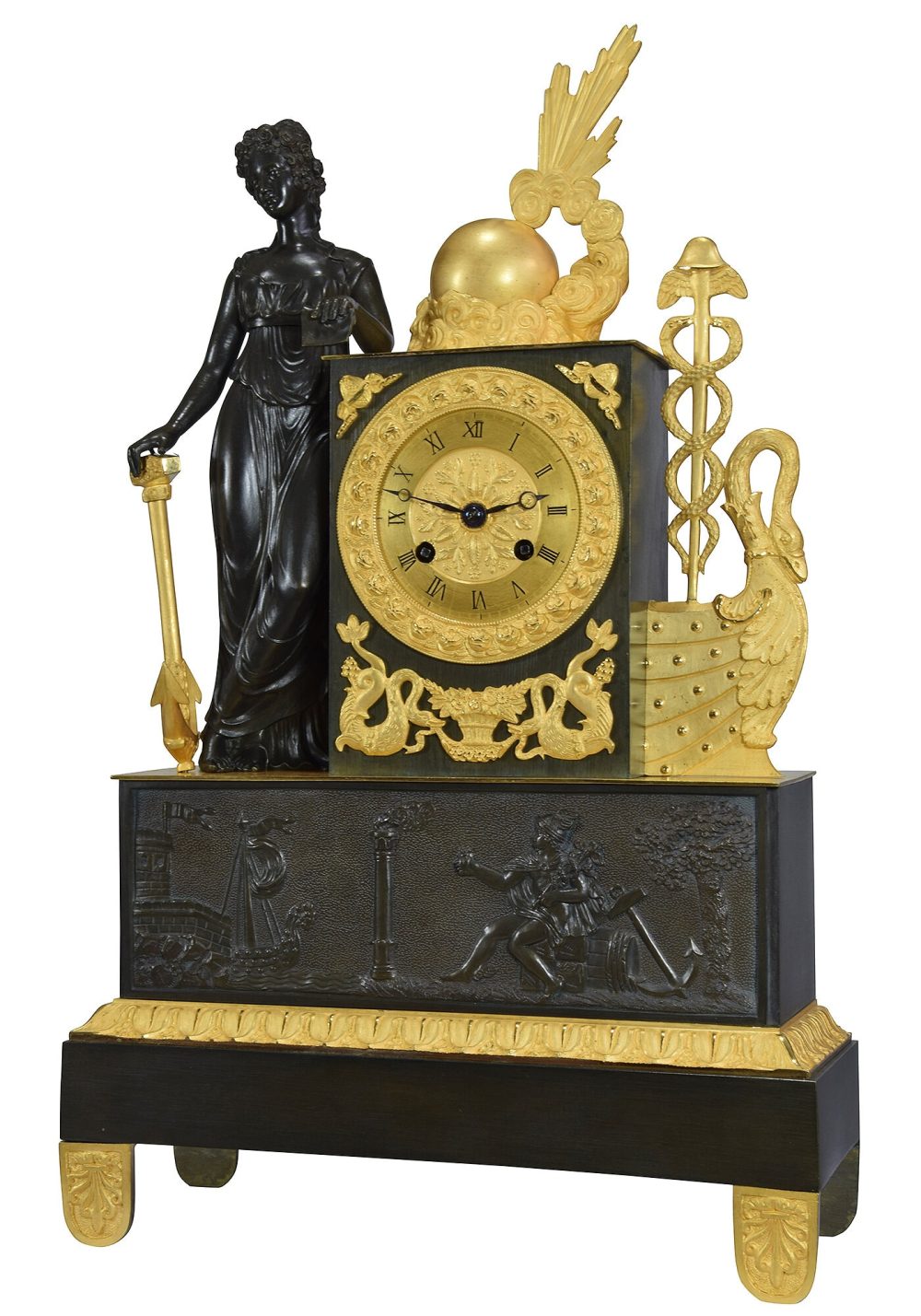 In patinated bronze and bronze gilded with mercury, high quality set. Interesting and magnificent clock on the theme of maritime trade with the figure of a Nereids. The daughter of Ocean, the sea goddess Thetis. Represented standing leaning on a marine anchor next to a terrestrial globe carried by a cloud of clouds and a ship's hull decorated with the caduceus of Hermes. Large bas-relief on maritime trade with the figure of the god Hermes.