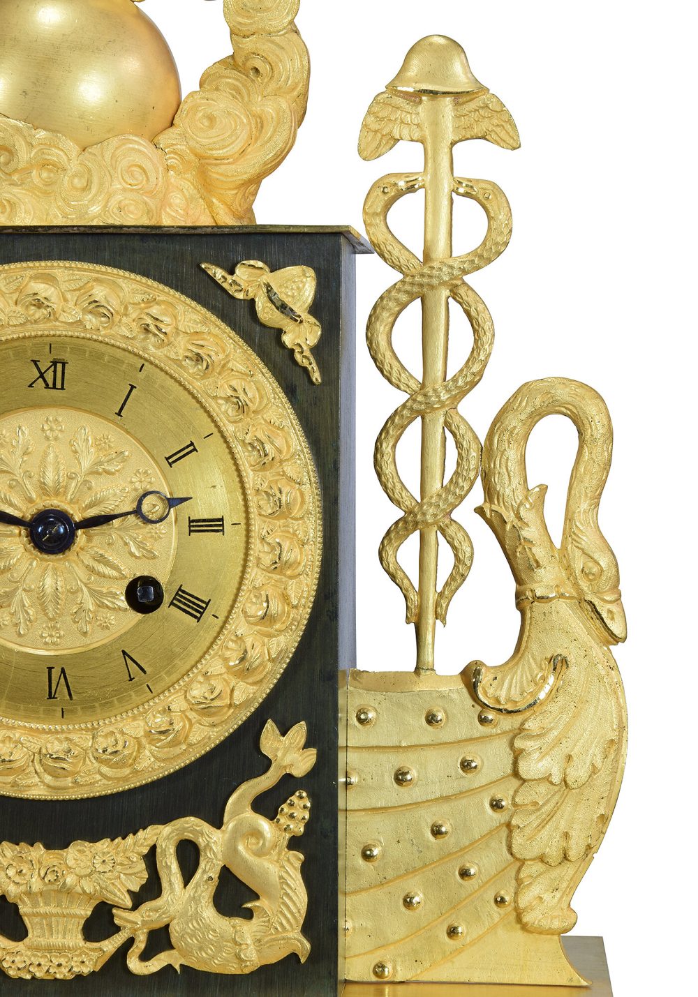Bronze dial underlined by an outline of flowers adorned with corners and a chiseled frieze of fish-tailed swans carrying a basket.