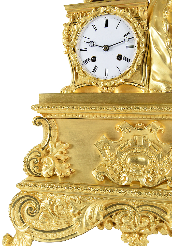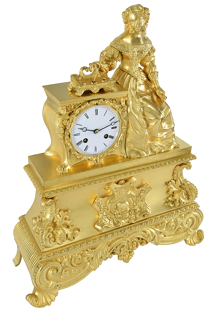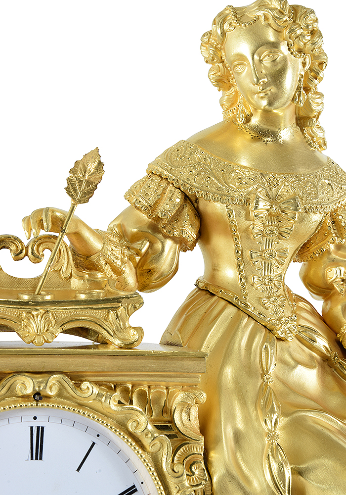 Large clock from the Restoration period circa 1830, of very good manufacture. entirely in gilded bronze with mercury. A figure, very finely carved and rich details. of Madame de Sévigné, a letter-writer from the 16th century, leaning on her desk. on top rests a richly crafted inkwell. White enamel dial accompanied by its fine hands.