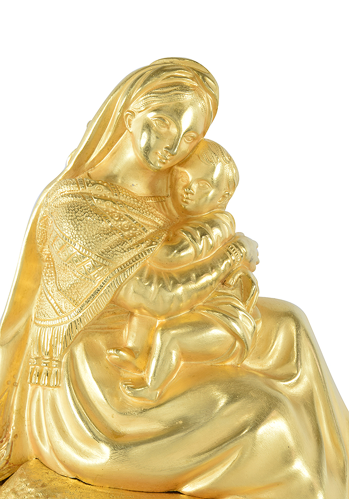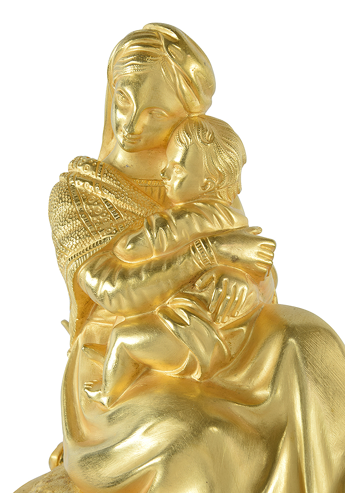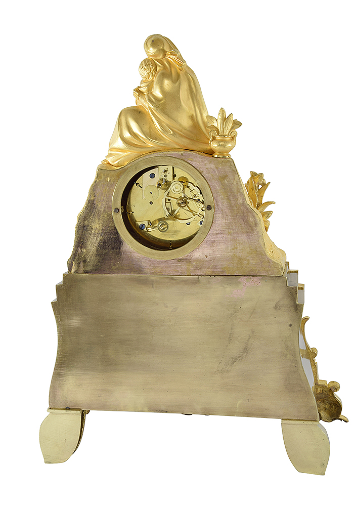 Bronze doré au mercure, superbe dorure. Figurant une maternité d’après « la Madone à la chaise » du peintre Raphaël (1483-1520). Reposant sur une base en bas-relief à décor d’un angelot, mouton et de plantes d’eau. Cadran en émail blanc accompagné par de fines aiguilles dorées.