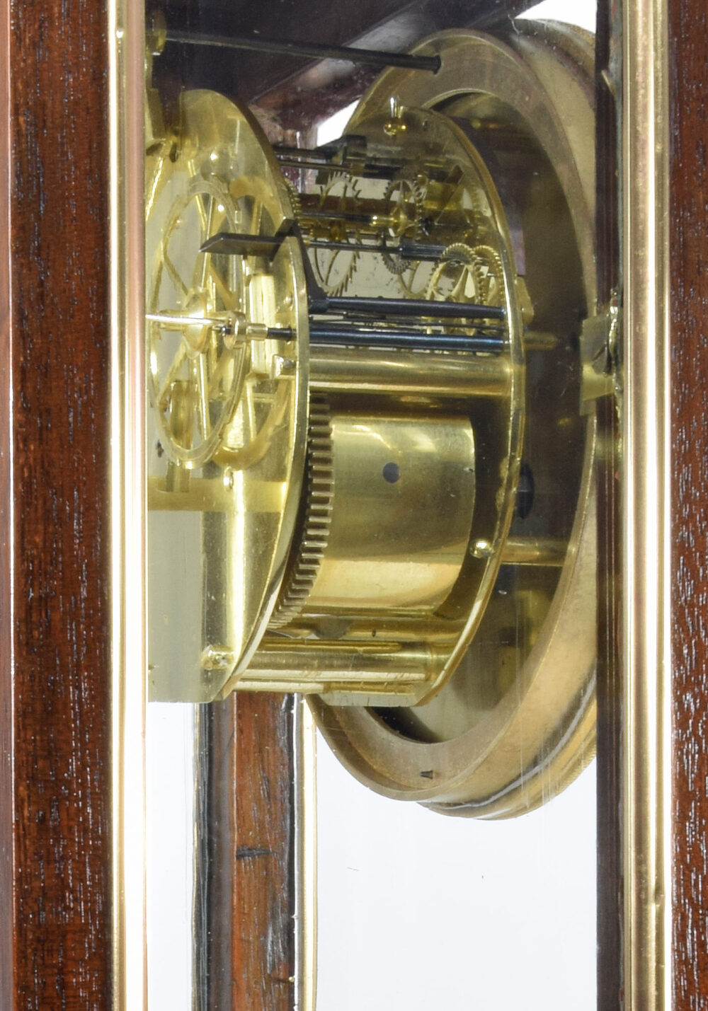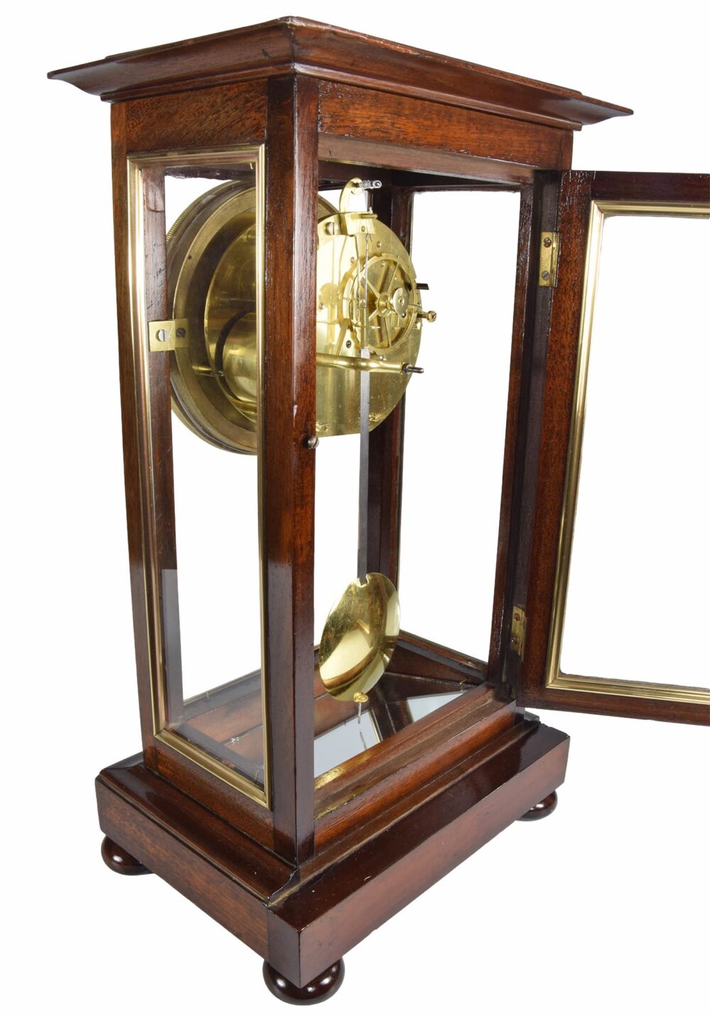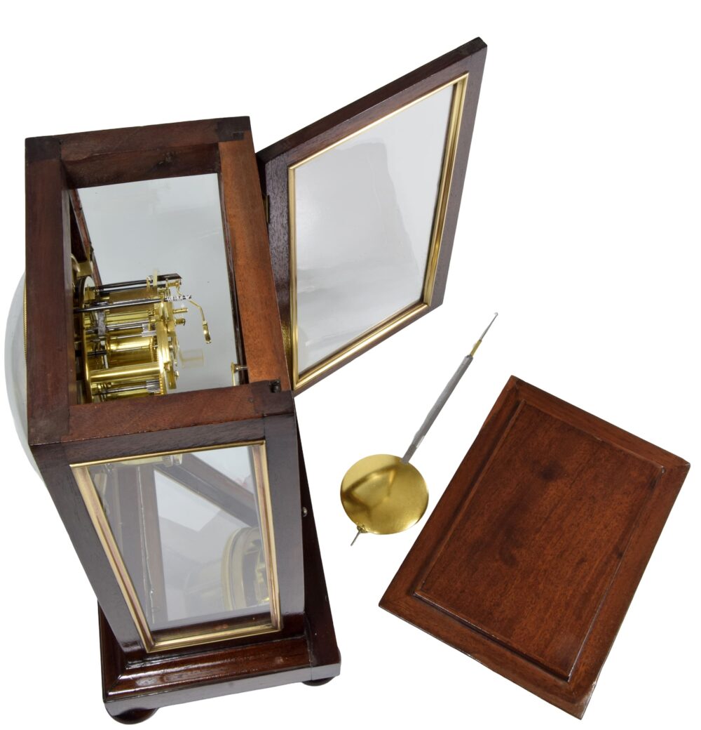 The interior is equipped with a mirror reflecting its mechanism and its pendulum lens, also in mercury-gilt bronze, suspended from a hardened steel rod.